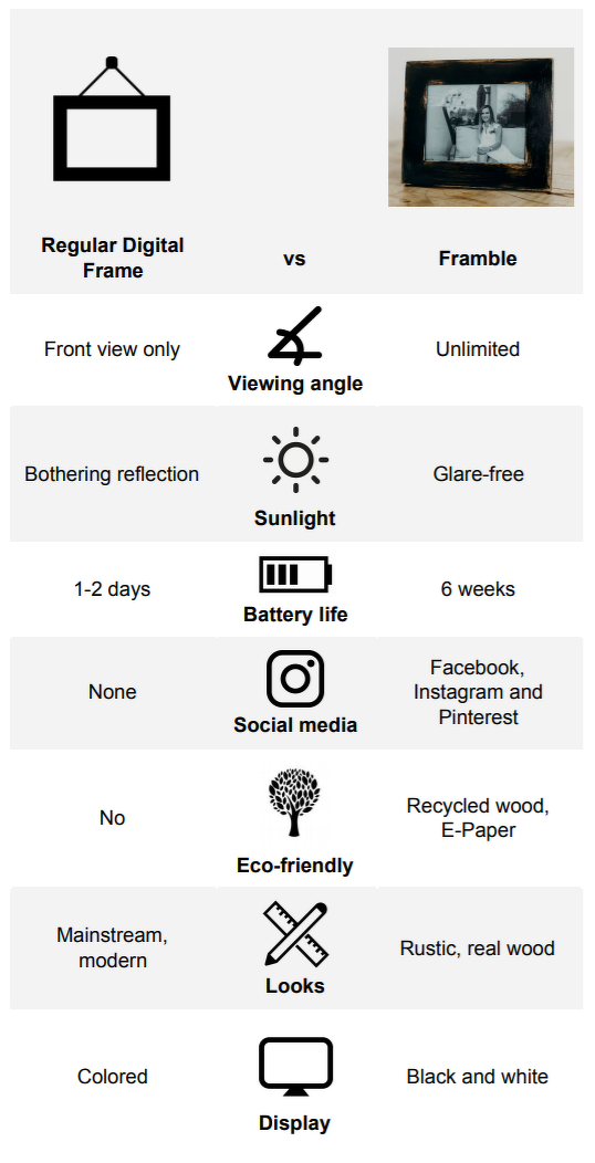 Értem, köszönöm, hogy kifejtetted. Én úgy gondolom, hogy a konkurenciához képest olyan előnyeink vannak, ami kompenzálja a fekete-fehér képet, mint pl. kézzel készített fa keret (a legtöbb keret műanyag, esetleg fém), közösségi média támogatás (ez is nagyon ritka, összesen egy keretről tudok, ami tud importálni Instagramról, de nem automatikus), illetve maga az E-Paper technológia a színeket leszámítva, mindenben megelőzi színes versenytársait (látószög, fényvisszaverődés, kontraszt, háttérvilágítás és a legfontosabb: energiatakarékosság), aminek köszönhetően a keret hetekig képes üzemelni. A legtöbb keret vagy kábelen lóg, vagy pár óra az üzemideje.