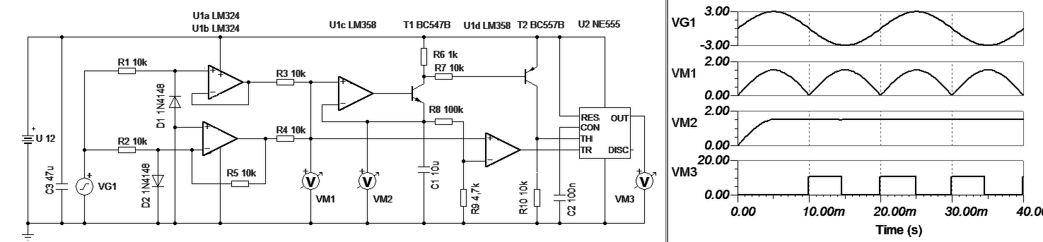 - Az U1a és U1b fokozat egy kétutas egyenirányító. Azért szükséges, mert a jel negatív félperiódusában is van teendőnk. - Az U1c egy csúcsegyenirányító. ennek két feladata van. Képzi a jel csúcsértékét és ennek 1/20-ra leosztott értékével (R8/R9) referenciát képezve detektáljuk U1d komparátor segítségével a nullpontot. Ez a jel billenti be az U2 RS tárolót. - Minden félperiódusban a csúcsérték után, az R8/R9 picit csökkenti a C1 csúcsfeszültségét. A következő félperiódusban, mikor a jel csúcsértéke magasabb mint a C1 értéke T1 újratölti a C1 kondit. Ezt a töltési pillanatot erősíti fel a T2 és visszabillenti az RS tárolót. Gond lehet, ha a jel túl gyorsan változik a jel, mert a C1-nek követni kell a feszültség csúcsértékét. Felfelé ez gyors, de lefelé a C1*(R8+R9) értéke fogja ezt meghatározni. Nos, kb. ennyi, amit nyújtani tudok. Az ábrán 3V csúcsértékű 50Hz-es jelet dolgoz fel az áramkör.