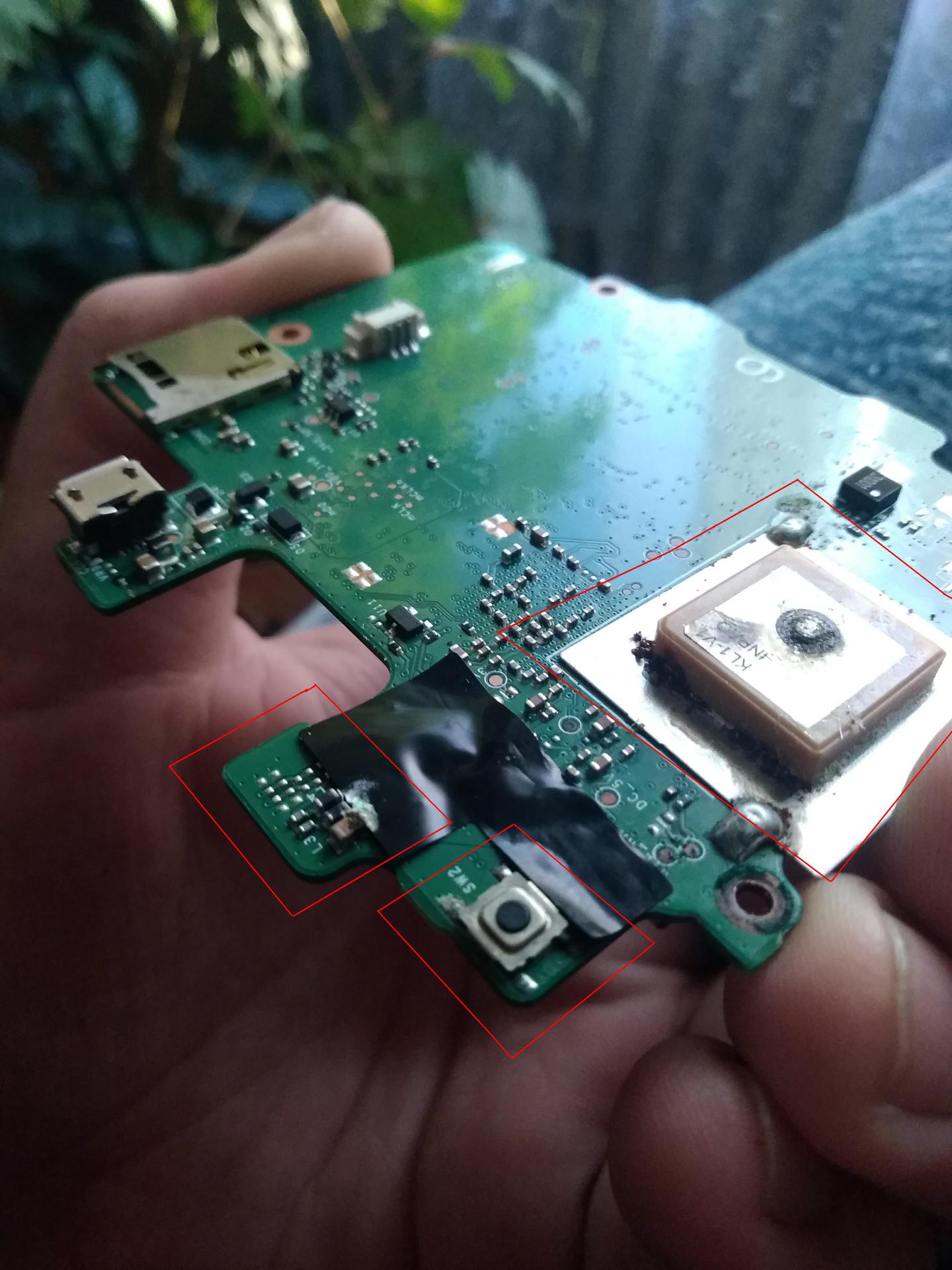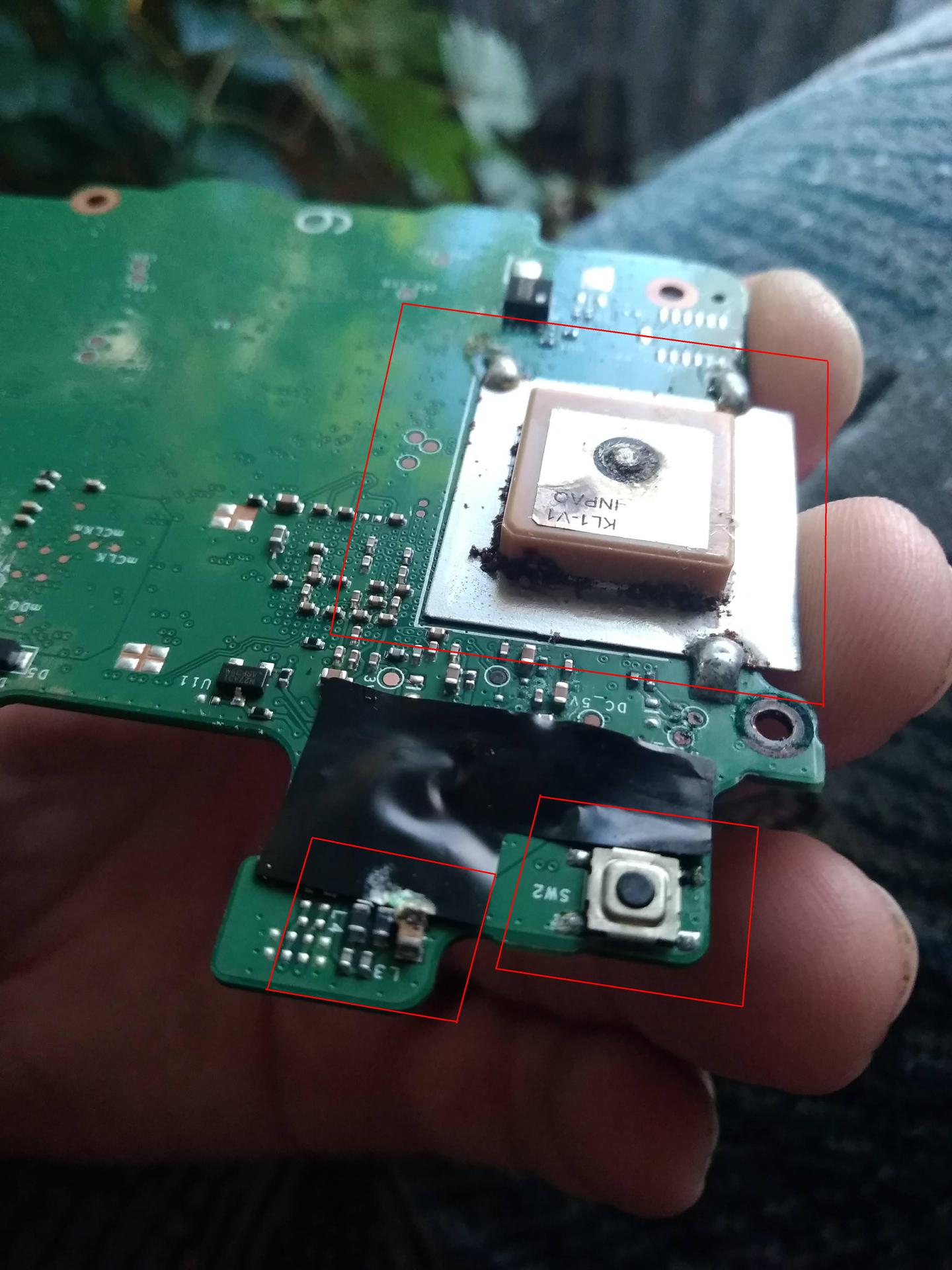 Kaptam egy Tomtom 4EN52 Z1230 GPS-t javításra. Tulajdonos elmondása szerint működőképesen el lett rakva szekrénybe pár 2 évig, majd újra elővétel után nem kapcsol be, töltést nem fogad, számítógép nem ismeri fel. Szétszedve mindjárt meglett a probléma forrása a Li-ion akku szétfolyt benne és a folyadék elkezdett dolgozni az alaplapon. Az első két képen bejelöltem ahol látható károkat okozott az akkufolyadék. A készülék bekapcsoló gombjának lábai, lent ellenállás, meg a chip antenna lemeze rozsdásodott be. Az alkatrészeket javítottam újraforrasztással (a kapcsolót szerintem cserélni kellene mert benne is jó oxidos lehet), a lemezt fényesre csiszoltam. A chip antennát nem forrasztottam még vissza így próbáltam bekapcsolni de semmi, csak a 6. képen jelölt alkatrész melegszik. Hol keressem még a hibát, esetleg lehet hogy akku nélkül be sem kapcsol?