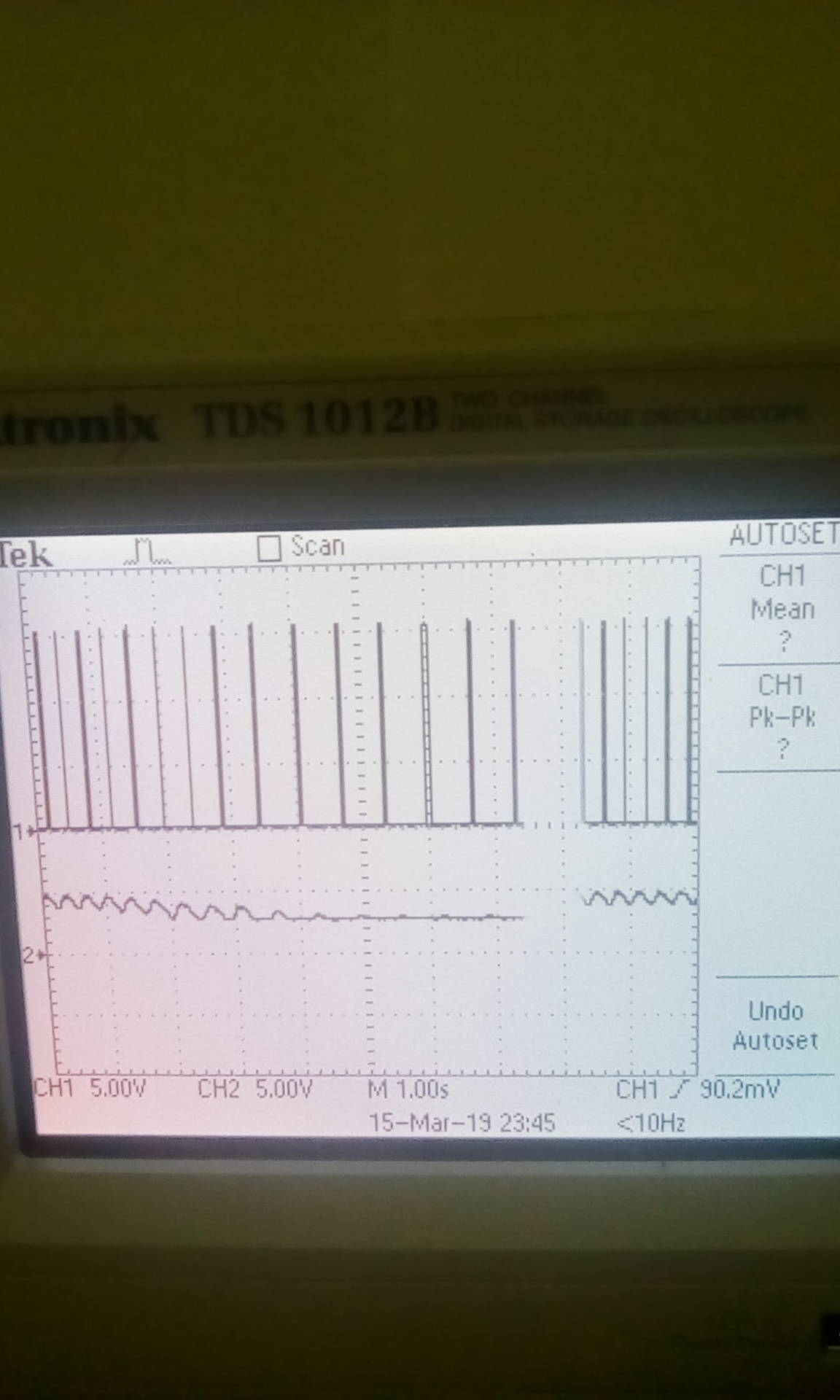 ,egy kis kiegèszìtèssel itt is szaggatott a motor egy kicsit induláskor ezèrt raktam be egy 2 voltos előfeszìtèst1. kèp . Jòl látszik a 2monostabìl működèse 2. kèp. A fordulatszám változásával jòl kivehető a kimenö feszültsèg változása az induktìv jeladò jelènek változásának arányába.