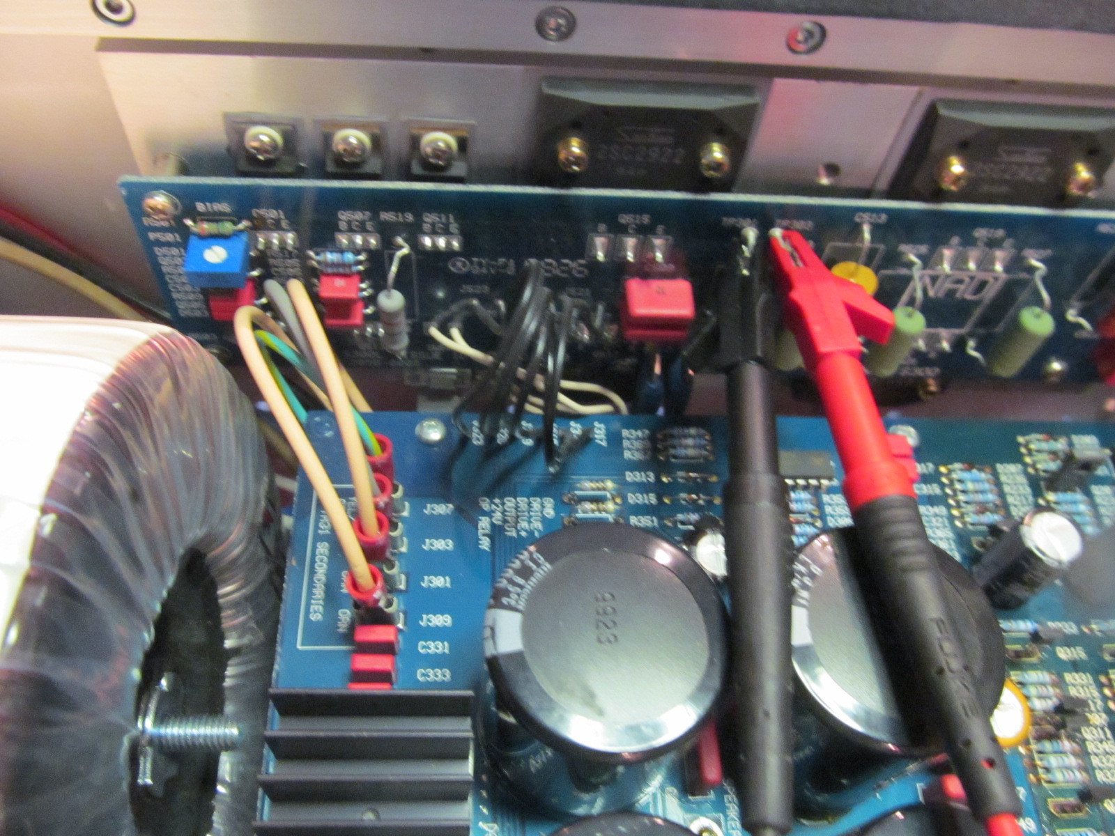 Javítási segédletnek szánom a leírást, hátha más is belefut ebbe a hibába S-300 végerősítővel kapcsolatban, lévén konstrukciós hibáról van szó.(Szerintem) Nem találtam külön ezzel az erősítővel topic-ot, a kommersz NAD , és erősítős topicban is idegen lenne a téma, lévén high-end erősítőről van szó. Amennyiben nem megfelelő a választás, áthelyezhető, ha nincs érdeklődés törölhető. Javításra került hozzám egy kedves kollégám/barátom NAD S-300 végerősítője. Hibaleírás: Torzan szól, recseg, egy idő után már bekapcsolás után folyamatosan aktív a hangszóróvédelem, nem működik. Előkészületek: Service Manual beszerzése, elektronikus formában elérhető: NAD S300 SM Hibabehatárolás: Mérések: Tápfeszültségek, végfok táp rendben, (+/-58V DC rendben) Hangszóróvédelem aktív. Kimeneten DC feszültség (jobb csatorna +4,3V, bal csatorna +5,9V) mérhető. C311/313 C312/314 enyhe kapacitásvesztést mutat,(470µF/63V) Előerősítő/meghajtó fokozat (Gain Stage)a panelen elszíneződve, magas hőmérséklet okozta problémát mutat. (Q316-318, és Q315-317 átvezet) valamint Q303,311,307,309,313,305/ Q304,306,312,314,308,310 is túlmelegedés nyomokat mutat. Úgy döntöttem, az összes ilyen félvezetőt cserélem.(16db) A típusok a SM-ban megtalálhatók. Alkatrész beszerzés: Csak megbízható helyről rendeljünk félvezetőket, (Farnell, TME,stb) a Zetex gyártmányokból rengeteg a hamis. A Farnell-tő rendelt ZTX653, a TME-től rendelt ZTX753 egyértelműen eredeti, az e-bay-es beszerzések mind hamis félvezetők voltak, Tektronix 370B Curve Tracer-rel tesztelve gyakorlatilag valamilyen átmaszkolt kommersz félvezetők, teljesen használhatatlan volt mind. A kondenzátorok szintén TME beszerzések.(Jó minőségű darabokat próbáltam beszerezni, Nichicon, és Rubycon márkákat) Javítás: A kapacitásvesztett kondenzátorokat, és a felsorolt félvezetőket cseréltem, valamint az R311/313 és R312/314 ellenállásokat megnöveltem 93Ω-ról 180Ω-ra.(NAD szervíz ajánlás alapján) A forrasztásoknál Metcal eszközöket használtam, ezzel mind a kiforrasztások,és a beültetések gyorsan, problémamentesen történtek. Élesztés/beállítás: Az erősítő bekapcsolása után beállítottam a nyugalmi áramokat. Bal oldal P501, TP301-303 mérőpontokon 35mV-ot állítottam be Jobb oldal P502, TP302-304 mérőpontokon 35mV-ot állítottam be, eközben már a hangszóróvédelem oldott, hallottam a relék kattanását, hogy jó úton járok. A beállítást bemelegedés után (30-40 perc) megismételtem. A kimeneteken nem mértem DC feszültséget, a hangszóróvédelem bekapcsolás után 20-30 mp múlva old, de ez ennél a típusnál ilyen, alapból is. Javítás után élőben is tesztelve lett, 2-3 óra zenehallgatás után került vissza a gazdájához. Remélem más is hasznát veszi ennek a leírásnak, aki ezzel az erősítővel, és az esetleges hibájával találkozik.