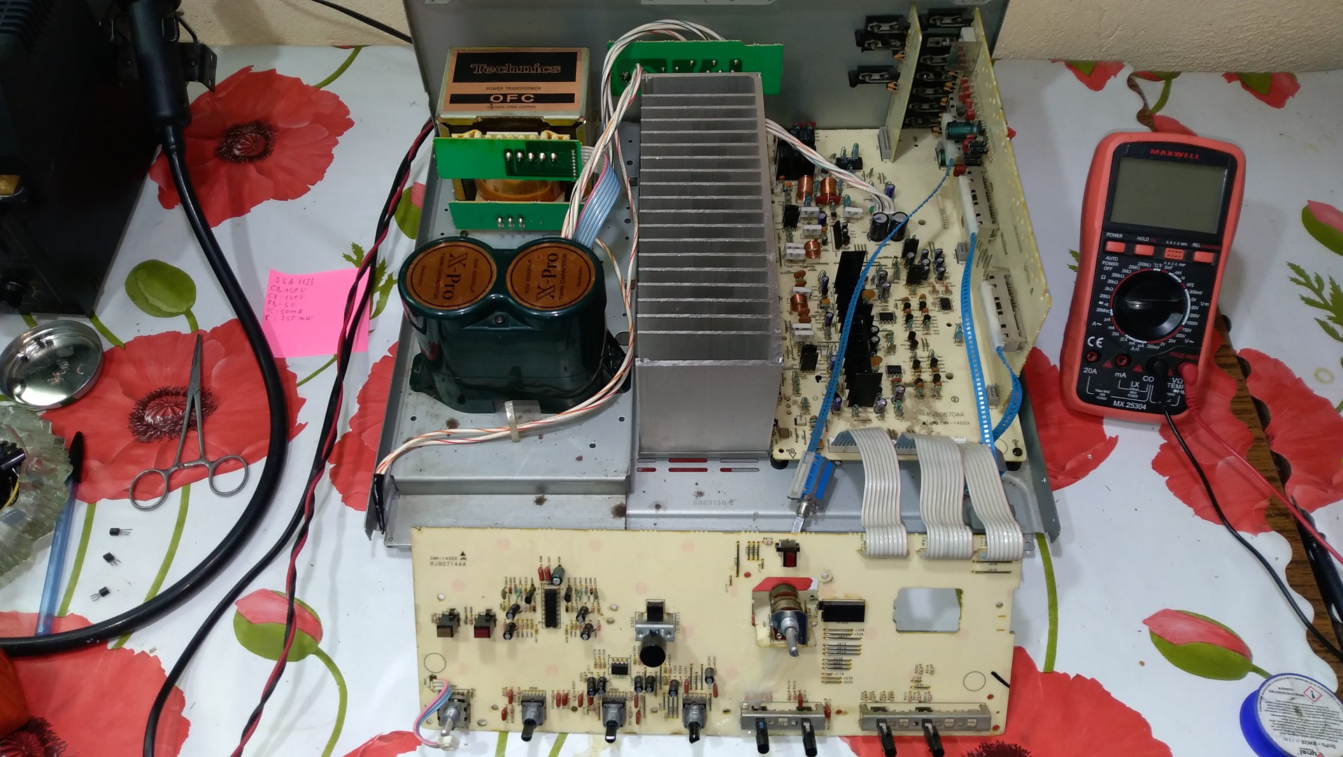 Hozzám került javításra egy TECHNICS SU VX -700-as erősítő javításra. Első kőrben az volt a problémája hogy le oldott a relé nagyobb hangerőnél, ezt sikerült meg oldanom az IC401-es (VOLTAGE AMP) Ic cseréjével a két tranzisztorával együtt (Q401, Q402). Most az erősítő, működik is, és nem old le a relé sem, viszont azt a furcsaságot csinálja hogy olyan jó háromnegyed hangerőnél az erősítő (CD lejátszóról hajtva) a hangszóró membránt ki hajítsa, tehát DC feszültség kerül a kimenetre valamiért, ezt a figurát el játssza mind a két oldalon, függetlenül attól hogy 4 vagy 8-ohmos terhelés van a kimeneten!. A feszültségeket mérve teljesen mindenhol rendben vannak, ugyan úgy a végfoknál mint (VOLTAGE AMP) résznél is. A finál résznél és az előérősítőben is ki cseréltem a kondenzátorokat, valamint át néztem az ellenállásokat és diódákat is, azok is rendben vannak. Amit észre vettem, ha ki forrasztom a LIMITER résznél a Q453, Q455, és ugyan úgy a másik oldalt is a Q454, Q456 tranzisztorokat, akkor meg szűnik ez az anomália. Az első gondolatom az volt hogy ki cserélem ujjakra ezeket a tranzisztorokat, ki is cseréltem hozzá nagyjából hasonló tranzisztorokkal BC337, BC327 (Jó tudom nem az a lábkiosztás, de úgy forrasztottam be hogy az jó legyen), a jelenség ugyan az, akkor ki cseréltem a diódákat is D453, D455, D454, D456 a jelenség úgyszintén meg maradt. Ez a négy tranzisztor az én látásom szerint figyeli a 2,2 ohmos ellenállásokon (R471, R743, R472, R474) eső áramot ha jól tudom?. A kérdésem az volna hogy miért nem lép fel ez a jelenség ha a tranzisztorokat (Q453, Q455, Q454, Q456) ki forrasztom? A másik dolog ezeket a tranzisztorokat a gyár bele tervezte, tehát kell a kapcsolásba, akkor miért nem működik jól?, hol lehet a hiba?. Még valami, ebben a LIMITER körben a kondenzátorokat is le cseréltem (C457, C459, C458, C460), tehát nem ezek az alkatrészek a hibásak. A feszültségek is rendben vannak a tranzisztorok lábain!. Aki tud azt kérem segítsen, mert el akadtam...