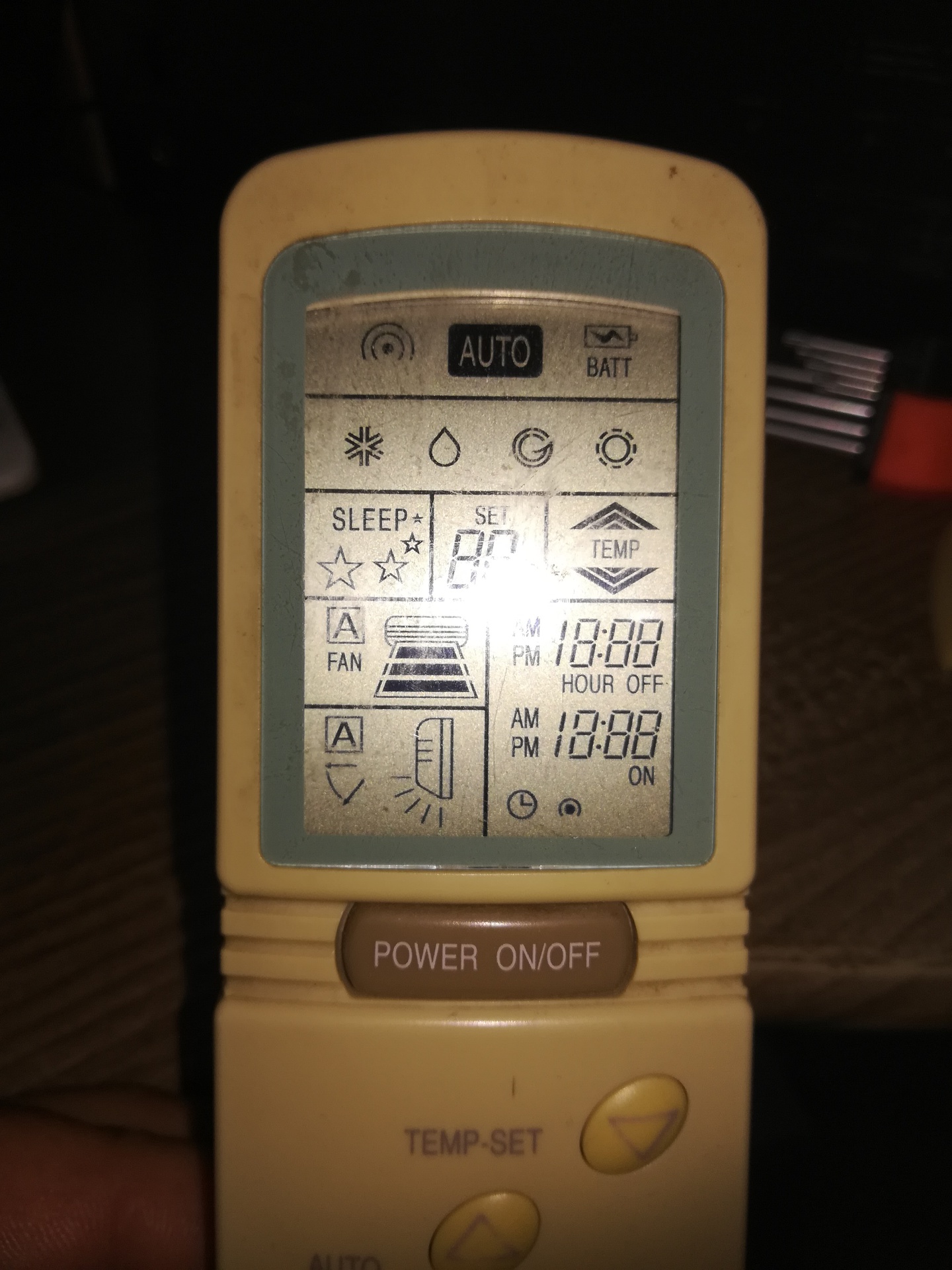 Nincs sok program: hűt-fűt-szellőztet, min-közép-max ventilátor. Így volt beállítva: hűtés, 18 fok, max. ventilátor, semmi extra.