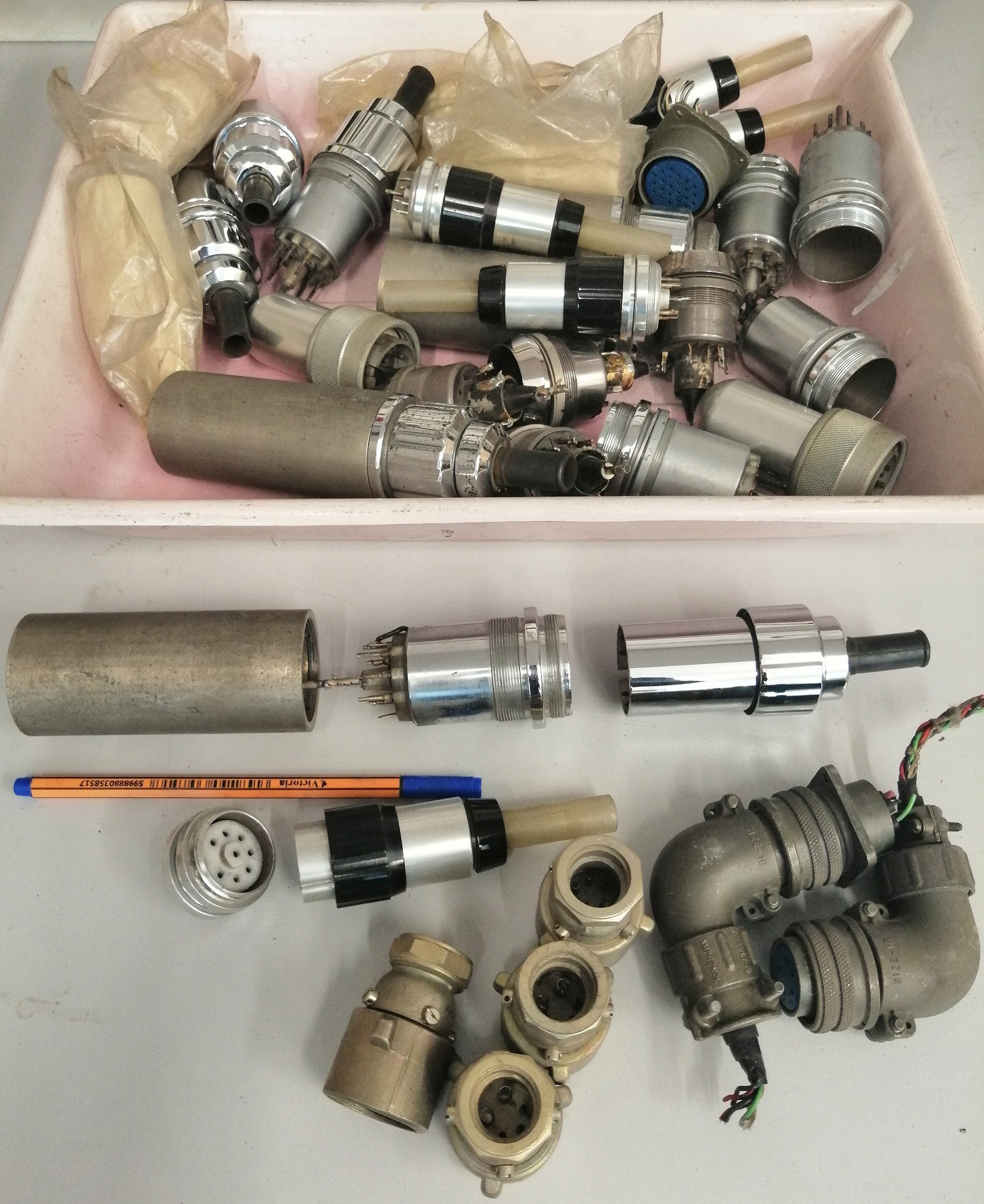 A képen láthat filctoll csak a méret érzékeltetése miatt van, azt nem adom hozzá... Átvehető előre egyeztetett időpontban, munkaidőben, Bp. Lágymányoson. - UFH csatlakozók / (Régebben Amphenol-nak hívtuk, de azóta már tudom, hogy az a gyártója volt...) Bontott, többé-kevésbé oxidálódott, a képen látható állapotban, sok. - Régi csatlakozók / Vegyesen, többnyire bontott, de van közöttük még használatlan is. Pl. DS-121, NDK, Csehszlovák és Szovjet gyártmányok, némelyike ellendarabbal. - Nagyfesz. csatlakozók / Egy részük használt, más részük bontatlan gyári csomagolásban. - TV kimenők / Bontott, csöves és félvezetős egyenirányítósok (azok hiányoznak belőlük). - Vegyes cuccok 1-2 / Bontott panelek, TV-kből (tunerek, hangolóegységek, KF fokozatok - Orion 70 és hasonló korú társaiból), műszerekből (A külön képen látható 4 db., Szovjet gyártmányú dióda is benne van a dobozban, talán látható a hűtőlap éle a jobb alsó részben)