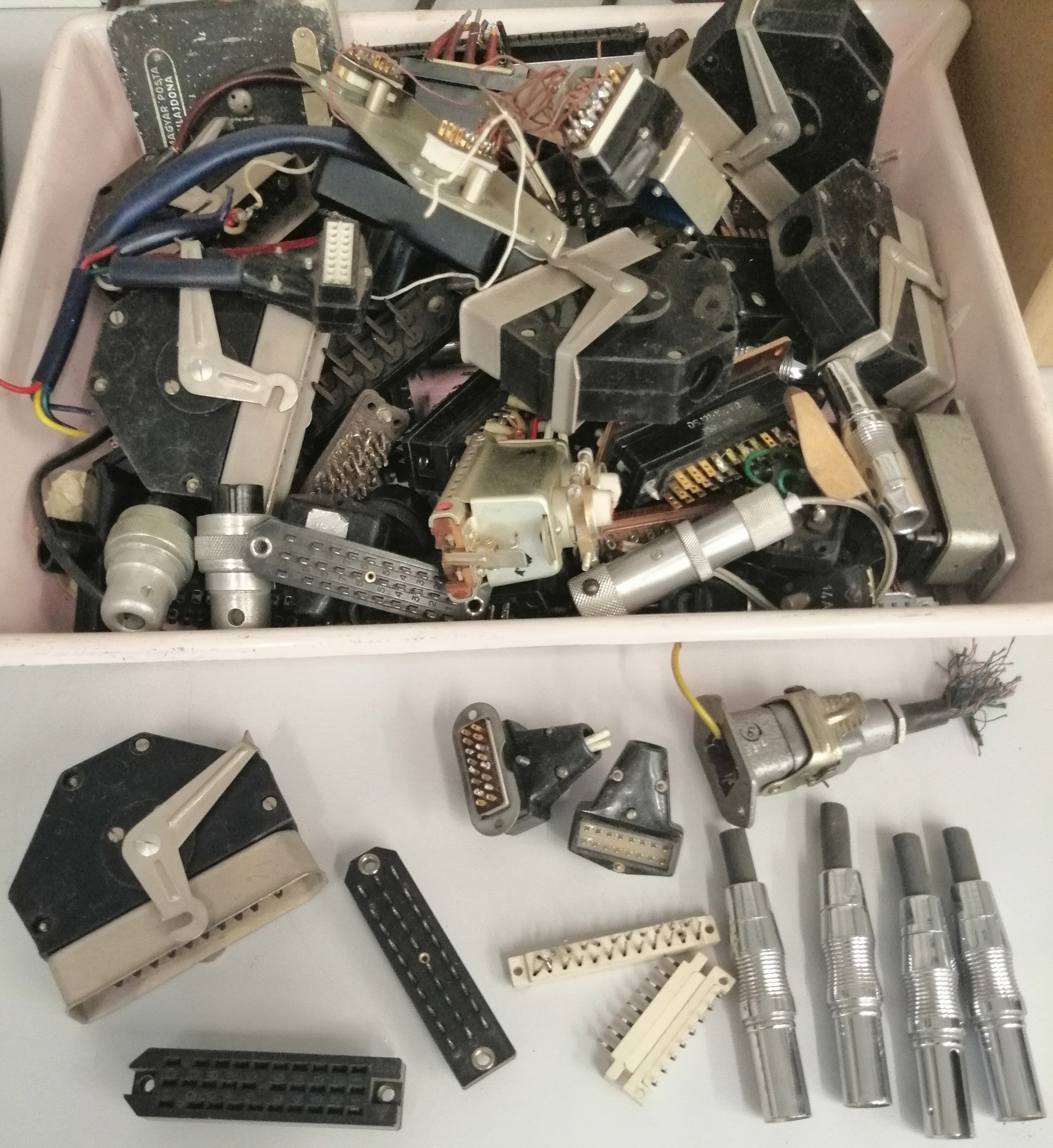 A képen láthat filctoll csak a méret érzékeltetése miatt van, azt nem adom hozzá... Átvehető előre egyeztetett időpontban, munkaidőben, Bp. Lágymányoson. - UFH csatlakozók / (Régebben Amphenol-nak hívtuk, de azóta már tudom, hogy az a gyártója volt...) Bontott, többé-kevésbé oxidálódott, a képen látható állapotban, sok. - Régi csatlakozók / Vegyesen, többnyire bontott, de van közöttük még használatlan is. Pl. DS-121, NDK, Csehszlovák és Szovjet gyártmányok, némelyike ellendarabbal. - Nagyfesz. csatlakozók / Egy részük használt, más részük bontatlan gyári csomagolásban. - TV kimenők / Bontott, csöves és félvezetős egyenirányítósok (azok hiányoznak belőlük). - Vegyes cuccok 1-2 / Bontott panelek, TV-kből (tunerek, hangolóegységek, KF fokozatok - Orion 70 és hasonló korú társaiból), műszerekből (A külön képen látható 4 db., Szovjet gyártmányú dióda is benne van a dobozban, talán látható a hűtőlap éle a jobb alsó részben)