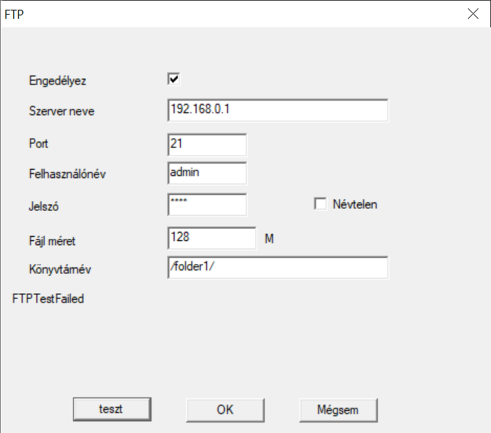 Nem tudom beállítani az Ip kamerát hogy ftp-re mentsen. Az elérséi út : ftp://192.168.0.1/folder1/