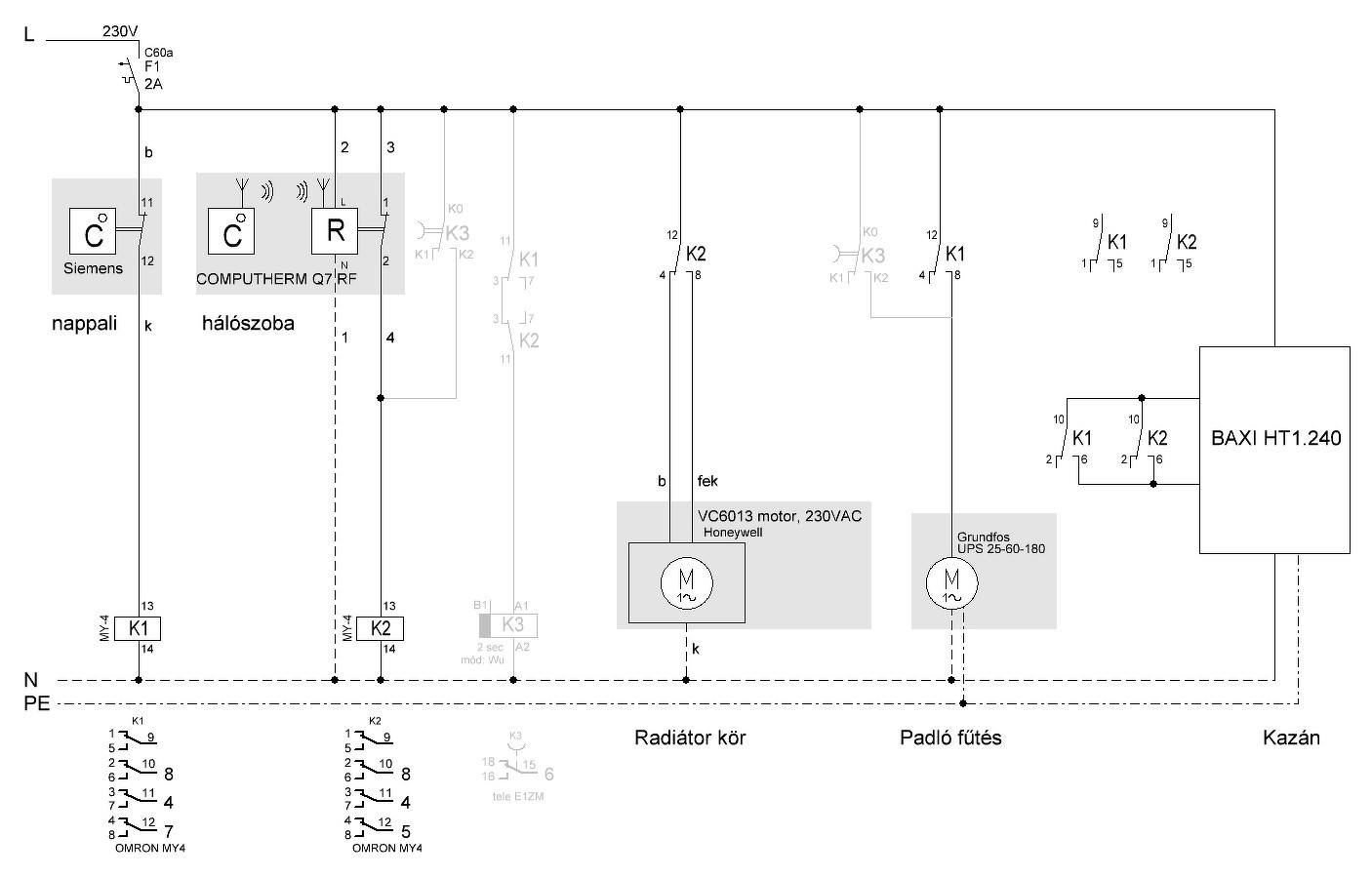 Adott egy FÉG gázkazán + szivattyú, melyhez egy 20+ éves termosztát volt kapcsolva, mi mostanra már ritkán sem szeret lekapcsolni. Három vezeték jön ki a falból: Fekete Barna Zöld-sárga Ebből a fekete és a barna van bekötve. Illetve van egy áthidalás (fekete és egy üres szál között), de ahogy a PCB-n nézem a trace-eket, az csak az éjjeli kapcsoló megléte miatt van ott. Sajnos nem olvastam utána eleget, és rendeltem egy digitális, programozható csodát. 4 bekötési pont van: 1: NC 2: NO 3: N 4: L Nagy lendülettel be is kötöttem a következők szerint: NO - barna N - zöld-sárga L - fekete Tök jó, a kijelző életre kelt. Manuális módban feltekertem a hőmérsékletet, kattan a relé, kazán bekapcsol... majd újra kattan a relé... ki/be másodpercenként 5x. Jól gondolom, hogy hülye vagyok és segédrelét kellene bekötni? (Ha még nem nyírtam ki) Vagy más lehet a baj? Olvasgattam itt, és úgy látom, hogy a "Dry Contact"-os megoldás lenne itt az ideális, de az elkövetkezendő ~2 hétben ennek kéne üzemelnie mindenképp. Előre is köszönöm a segítségeteket!