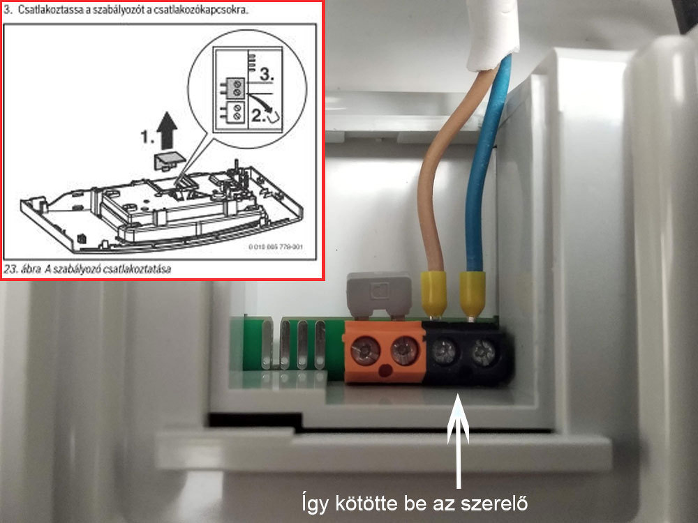 Ha tovább olvasod a használati utasítást, akkor fény derül arra is. Ahová most bekötötte a szerelő az a külső hőmérséklet érzékelő helye (13) számmal jelzett, mellette a (14) számmal a be-ki szabályzó az áthidalással és azután van az interfész csatlakozási lehetőség. Azt tudnod kell, hogy ha nem hozzá való termosztátot alkalmazol akkor nem lesz folyamatos szabályzás csak ki-be kapcsolgatás ami kis többlet költséget jelent hosszabb távon a gázfogyasztásban. Bővebben: Link