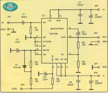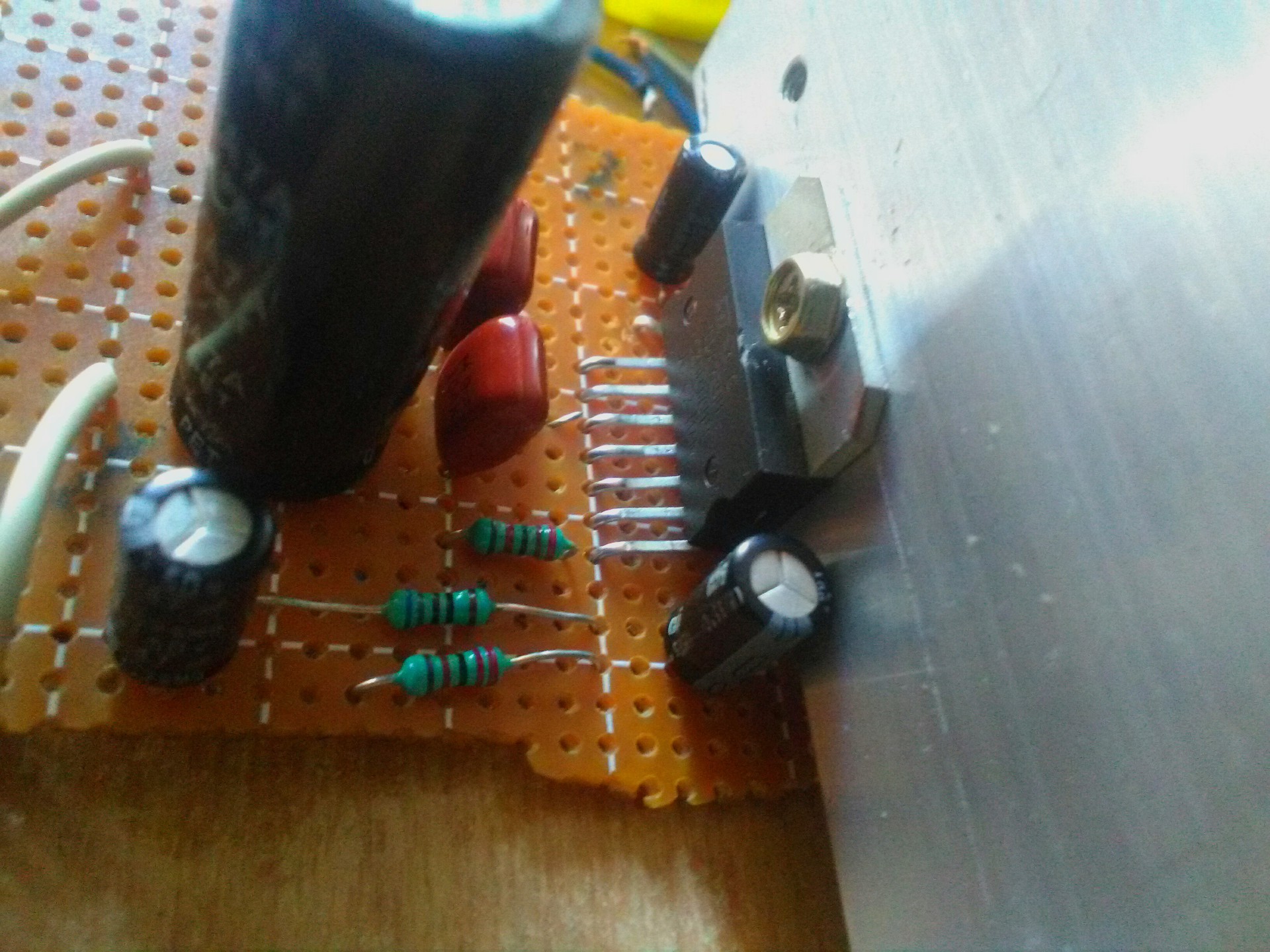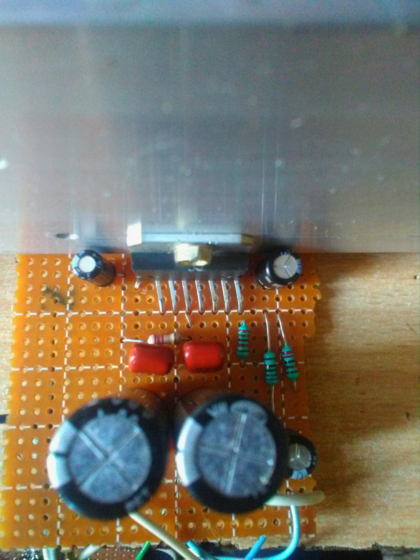 Annyiban tér el az eredeti rajztol ,hogy a STBY GND pin-t eltörtem és csak így ferdén sikerült eltalálni neki egy poziciót , valamint a bementnél az 1µF 63V os kondi-t nem tettem bele mert sajnos nincs ithon ienem csak elkóban