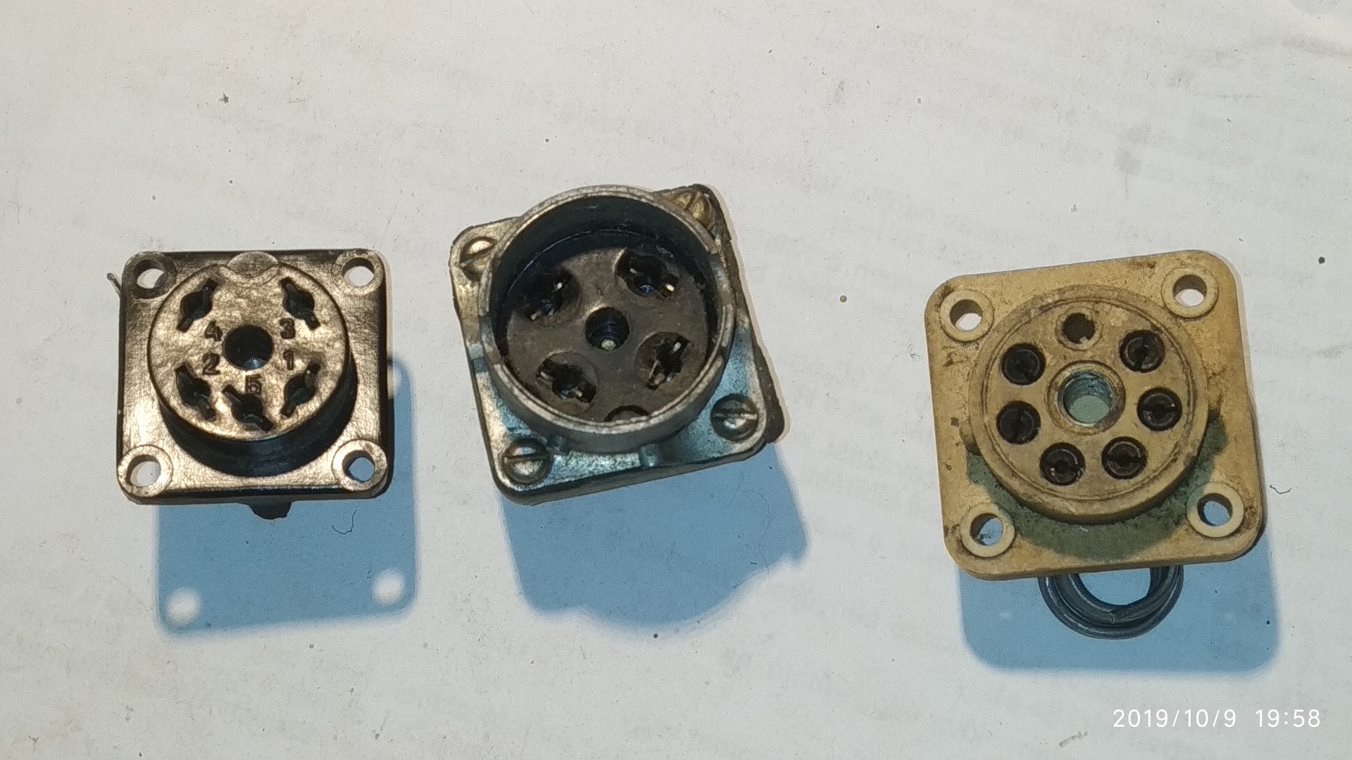 Honvédségi adó-vevők beszélőkészletének csatlakozói. Az első típus van az R108M rádión, középső van pl. az R105 rádión, az utolsó talán az R123 rádió csatlakozója.