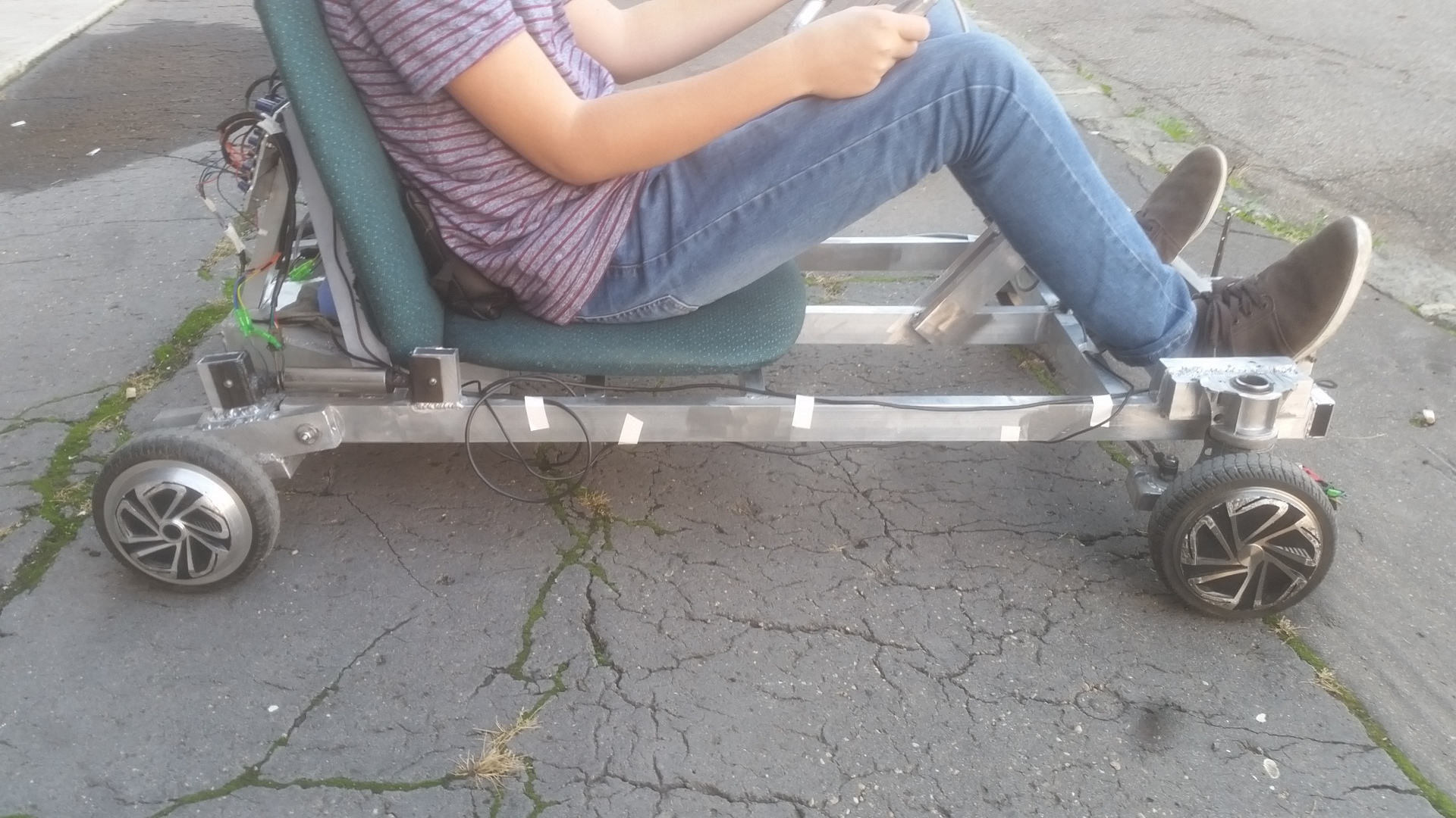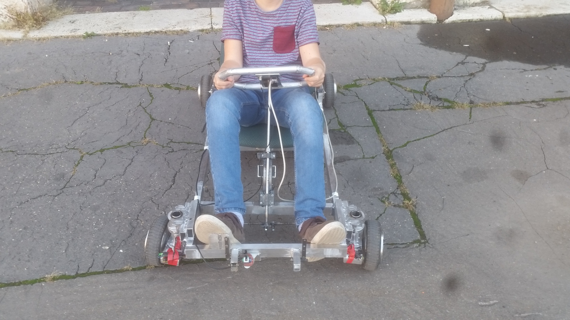Váza 40x20-as alu zártszelvény, a legtöbb dolog (pl. a kormánymű) a megunt segway és a pluszban vásárolt roncs segway alkatrészeiből készült. Két hátsó kerék hajtott és rugós karon ül, csapágyazva és acélbetéttel. A rugók régi bicikli teleszkóprugó kettévágva. A meghajtást egy új 36V, 4.4Ah-s Li-Ion akku végzi az agymotorokon át az eredeti alaplap segítségével. A töltő az eredeti játéké. Előre/hátrameneti kapcsoló és bekapcsológomb a kormányon. A gyerekek 20-30 percet tudják használni, alattam már gyorsabban kifárad A sebessége kb. mint egy lassabb bicikli.