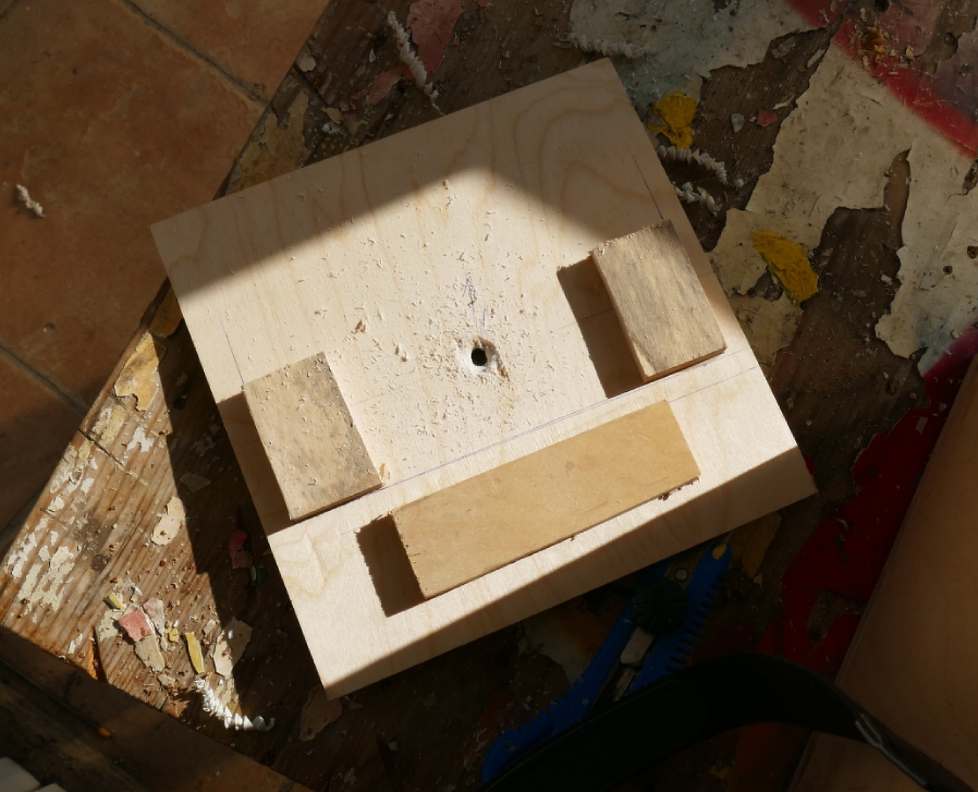 Van egy kézi kis marógépem de azt nem lehet megtartani pontosan. Ezért a marógép méretére nyomtattam két pár rögzítő elemet, amely merőlegesen tartja. A fedlap alján elcsúszás biztosító ütközök vannak és a lyuk ahol a marószár kibújik. Hőre lágyuló műanyag volt, ezért nagyon lassan és kihűlést megvárva folytattam a munkát. Leglassabb fordulaton. Ez az öt lyuk 25 percen belül megvolt.