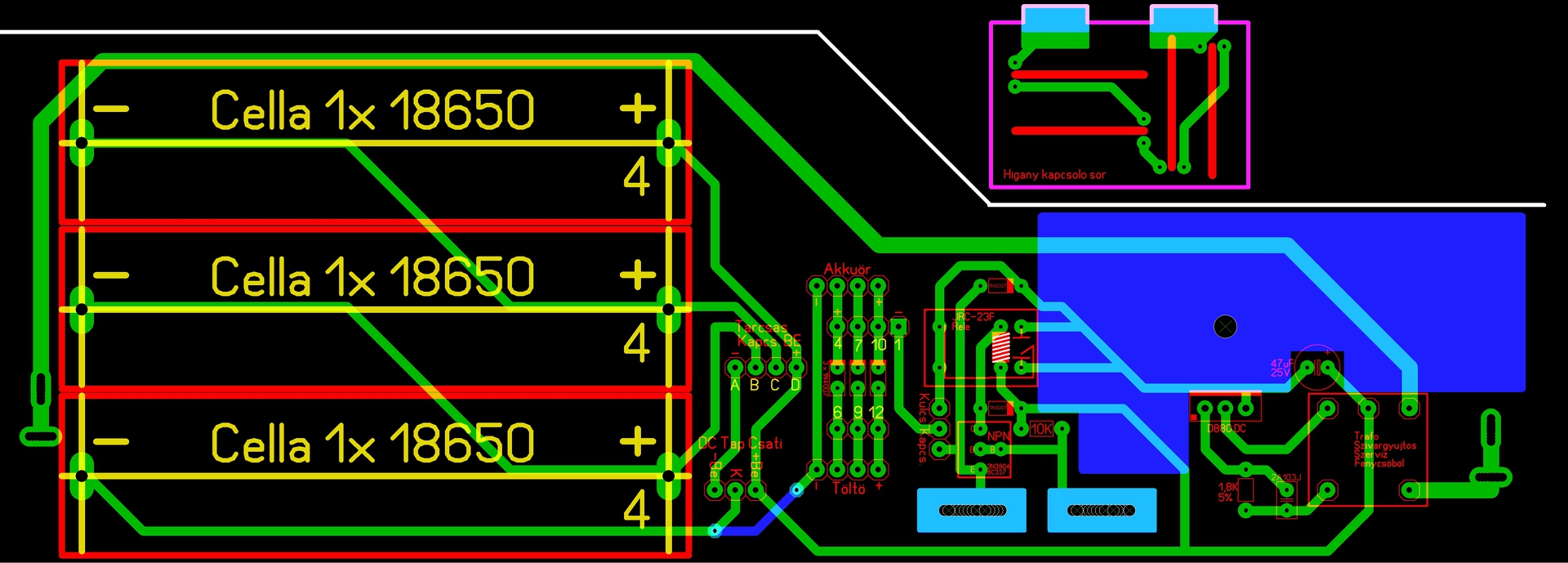 Tegnap amit felraktam nyáktervet, abban valóban sok hibát vétettem, akit érdekel annak felrakom a javított változatot alkatrész megnevezésekkel. Nem állítom hogy hibátlan, de sokkal jobb mint volt. A relé kimeneteit szándékosan kötöttem össze, nem volt még dolgom relével, ha a másik irányba húzna akkor szikével elvágom a felesleges vezetősávot.