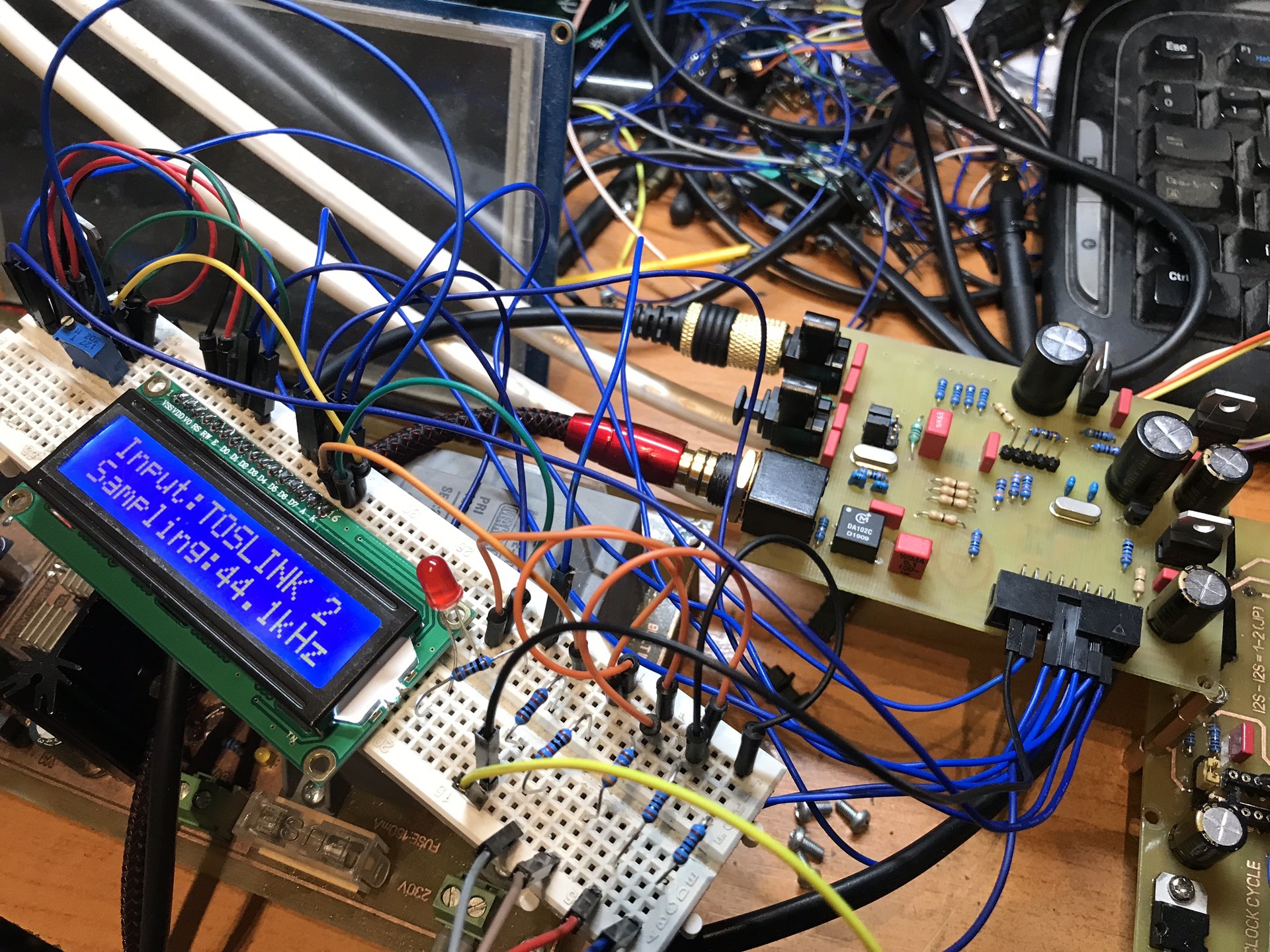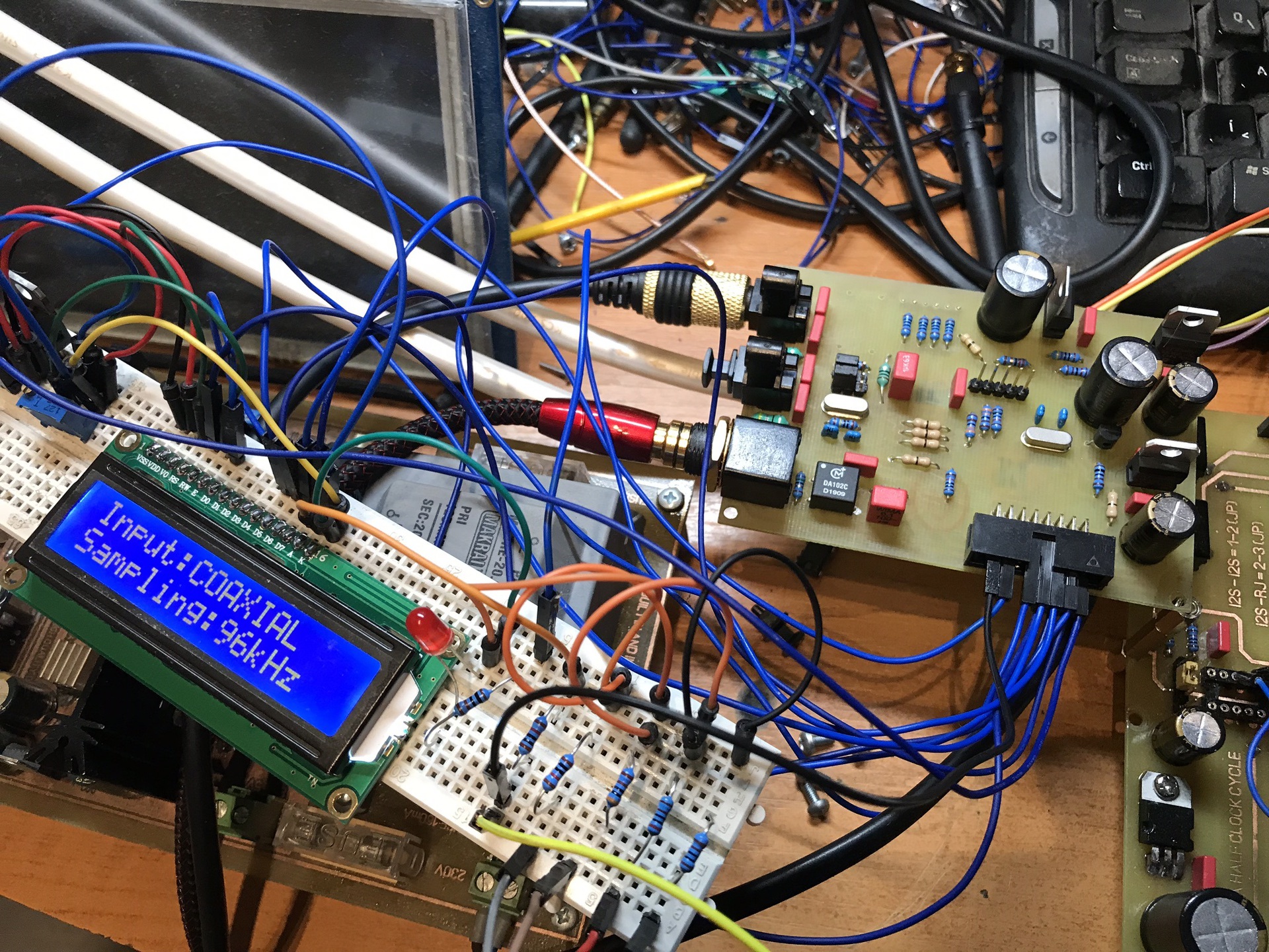 Elkészült az új panel a tegnapi nap folyamán. Tökéletesen működik! Az AVR-es program változatlan maradt. A különbség az előző nyákhoz képest, hogy nincs tüskés kivezetés az i2c-nek, az MCU egy panelon van a WM8805-el. Az előző panelnál az átvezető kábel lehetett a gond. Nem tudom hogy a minősége okozhatta, vagy a hosszára volt érzékeny, de többel is kipróbáltam 1 hete. Azzal a kábellal is, ami a képen látszik, és a karakteres kijelzőt köti össze. A másik különbség, hogy a WM8805-ös DVDD 3,3V-os tápjával közös az MCU-val. Múltkor csak a GND volt közösítve. Nem hiszem hogy ez okozhatta volna, de ez még, ami különbség.