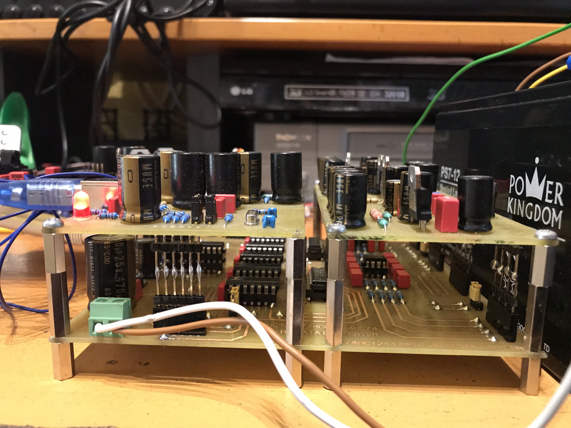 A WM8805 reset lába a mikrovezérlőhöz volt kötve. Én is 3,3V-al kommunikáltam. Természetesen felhúzó ellenállás is volt, hogy válaszoljak az előtted szólóhoz is. A CPU reset megoldotta a gondot, de azzal együtt a WM8805 is resetet kapott a reset lábán keresztül. A hang maradt, csak onnantól nem tudtam szoftveresen bemenetet váltani... Többet így hírtelen nem tudok mondani, mert mint írtam a panel bontásra került. Viszont már megterveztem az új panelt, péntek estére kész lesz, amin a WM8805 és a ATMEGA328 együtt lesz. Kicsit azért aggasztó, hogy neked gond nélkül ment külső kivezetéssel is, mert én Arduino mini-vel, PIC esetén meg Mikroe-s fejlesztőpanellal is próbáltam átkötő vezetékkel. Hardveres módban amúgy szépen működik. Hétfőn ezért bontottam a panelt, hogy helyette a mellékelt képen lévő hardveres változat elkészüljön. Csak két bemenet lett, és a kapcsoló hátul van. Mostani eszemmel máshogy csináltam volna meg a bemenetkapcsolást hardveres módban, és akkor a kapcsolónak sem kéne hátul lennie... Bár engem az kevésbél zavar. Véglegesnek készült, de haver is biztatott, hogy ne adjuk fel, ezért teszek még egy próbát a szoftveressel. Természetesen ha nem lesz jó, akkor részletesebben tudok majd válaszolni az egyéb kérdésekre. Mindenképp jelezni fogok péntek után. Köszi a választ!