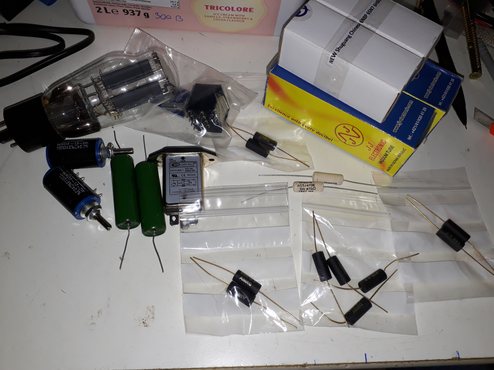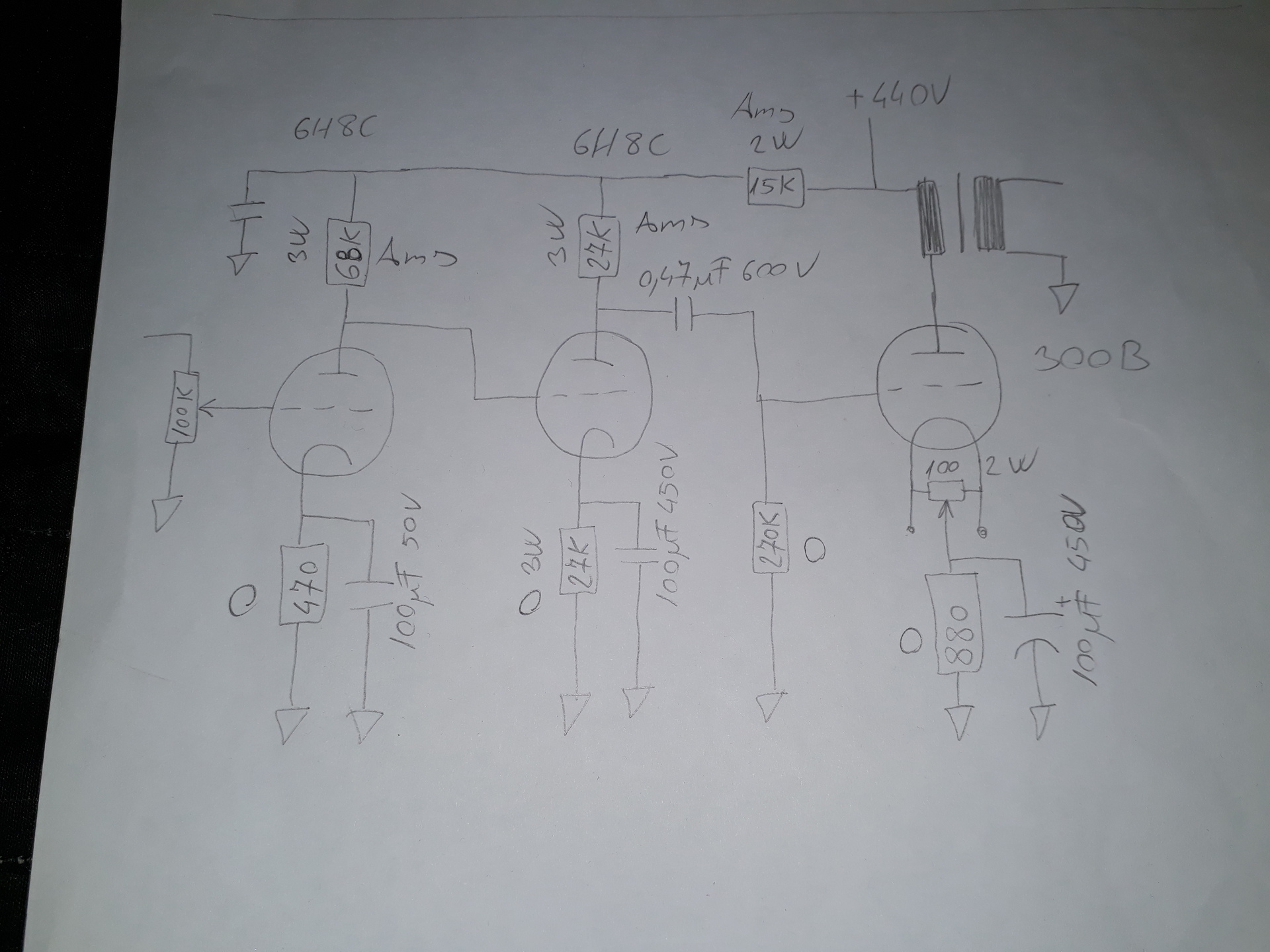 Az összes ellenállás 2 W Amtrans AMRG, 5 W Ohmite Audio Gold A katód ellenállás még hiányzik. Már úton van az ezüstözött tömör réz huzal, a magas ezüst tartalmú forrasz anyag, két Hammond fojtó, Mundorf elkók. A hálózati trafót én tekertem( EI 120), A kimenők Lundahl LL1623 lesznek. Elég drágák. Még várok a beszerzésükkel. A 300B PSVANE 300B-T MK2 lesz. 6SL7-ből van itthon JJ, Shuguang, meg orosz 6H9C. kipróbálom öket, ha nem lesz jó, veszek valami komolyabbat.