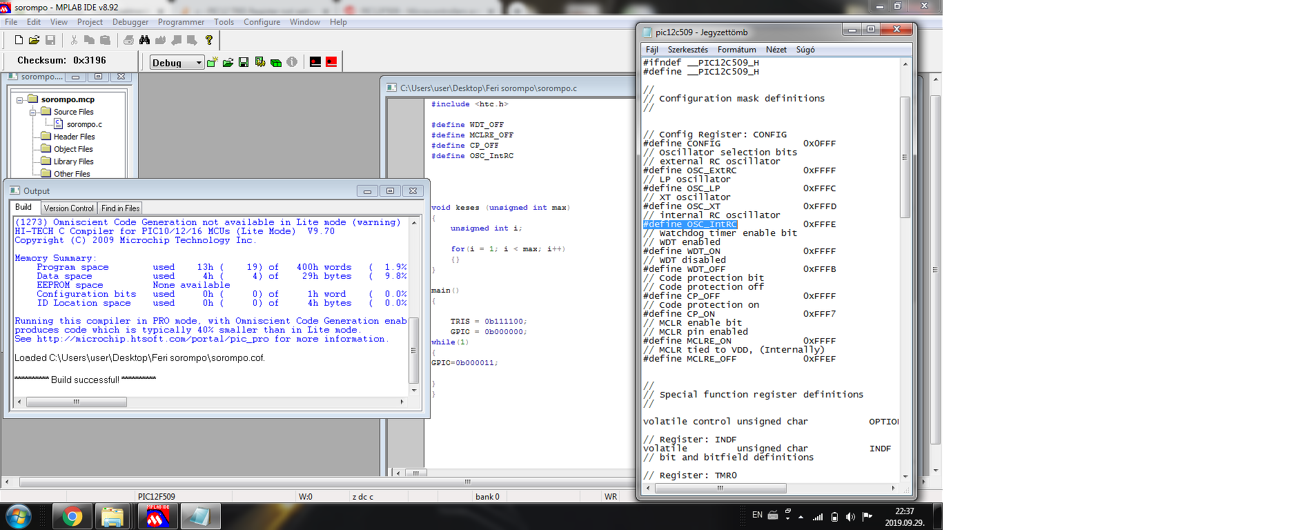 @ benjami: Nekem csak V9.83 -mal volt szerencsém kipróbálni, azon és a hozzászólásban láthatóan a 12F509 esetében is lefordul. Valami a 9.70 include állományai között nem stimmel. Nem érti az output ablakban felsorolt szimbólumokat. Meg kell vizsgálni a pic12C509.h tartalmát. A mellékletben a 9.83 -é. A hozzászólás módosítva: Szept 29, 2019