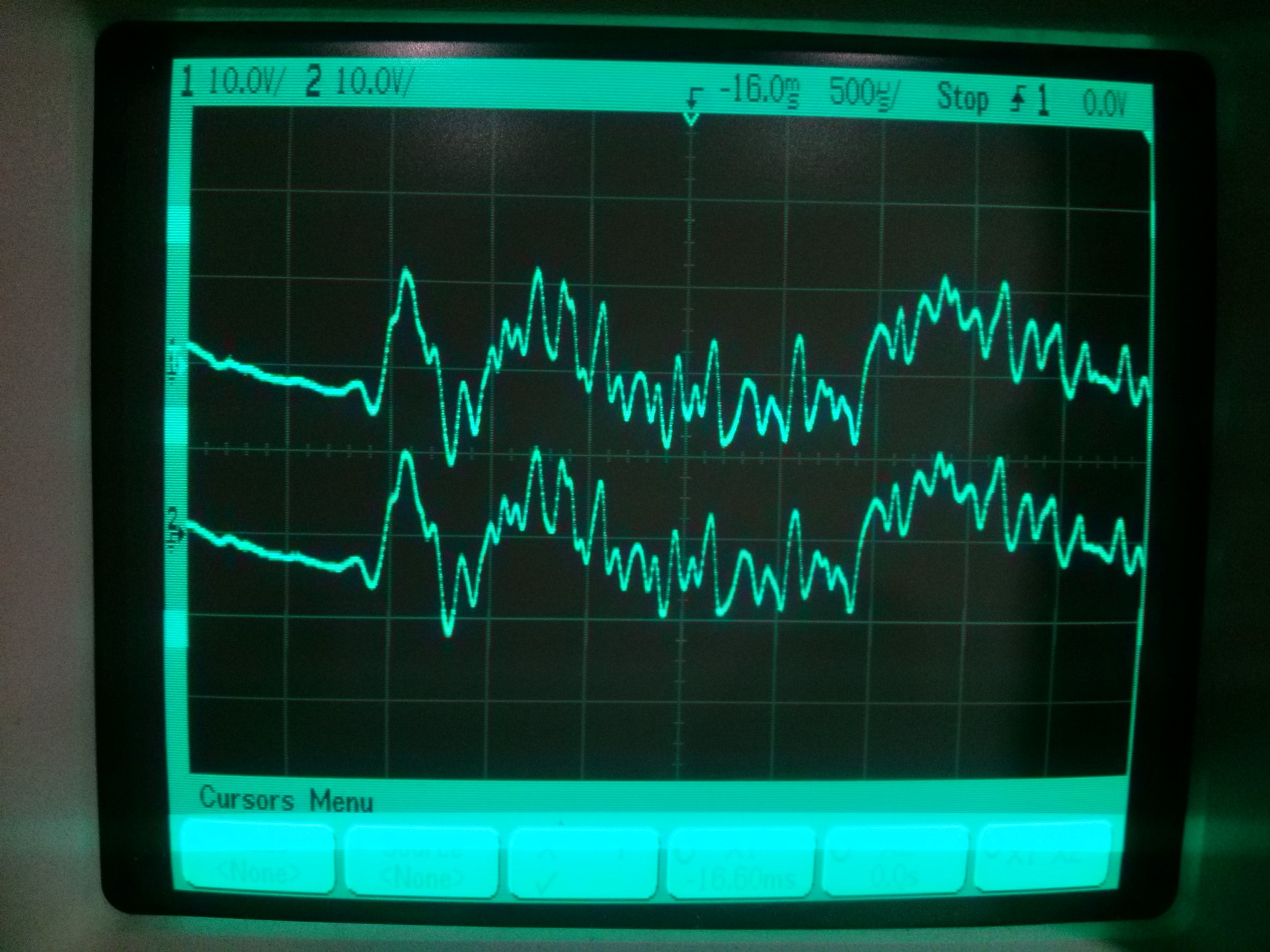 Az első két fotón az 1.ch a pozitív tápon, a 2.ch a negatív tápon. Azt vártam, hogy látni fogom a brummot a jelben, de nem látom. A második fotón a megnyújtottam a jelet, mert olyan, mintha nem lenne fázisban a 32. ms-nél a két táp, de abban van. A 3. és 4. fotón az 1.ch a pozitív táp, a 2.ch a kimenet. Így sem látszik a brumm. Mindjárt megnézem műterhelésen szinusszal. (A negyedik fotón nem a végfok klippel hanem a felvétel ilyen.)