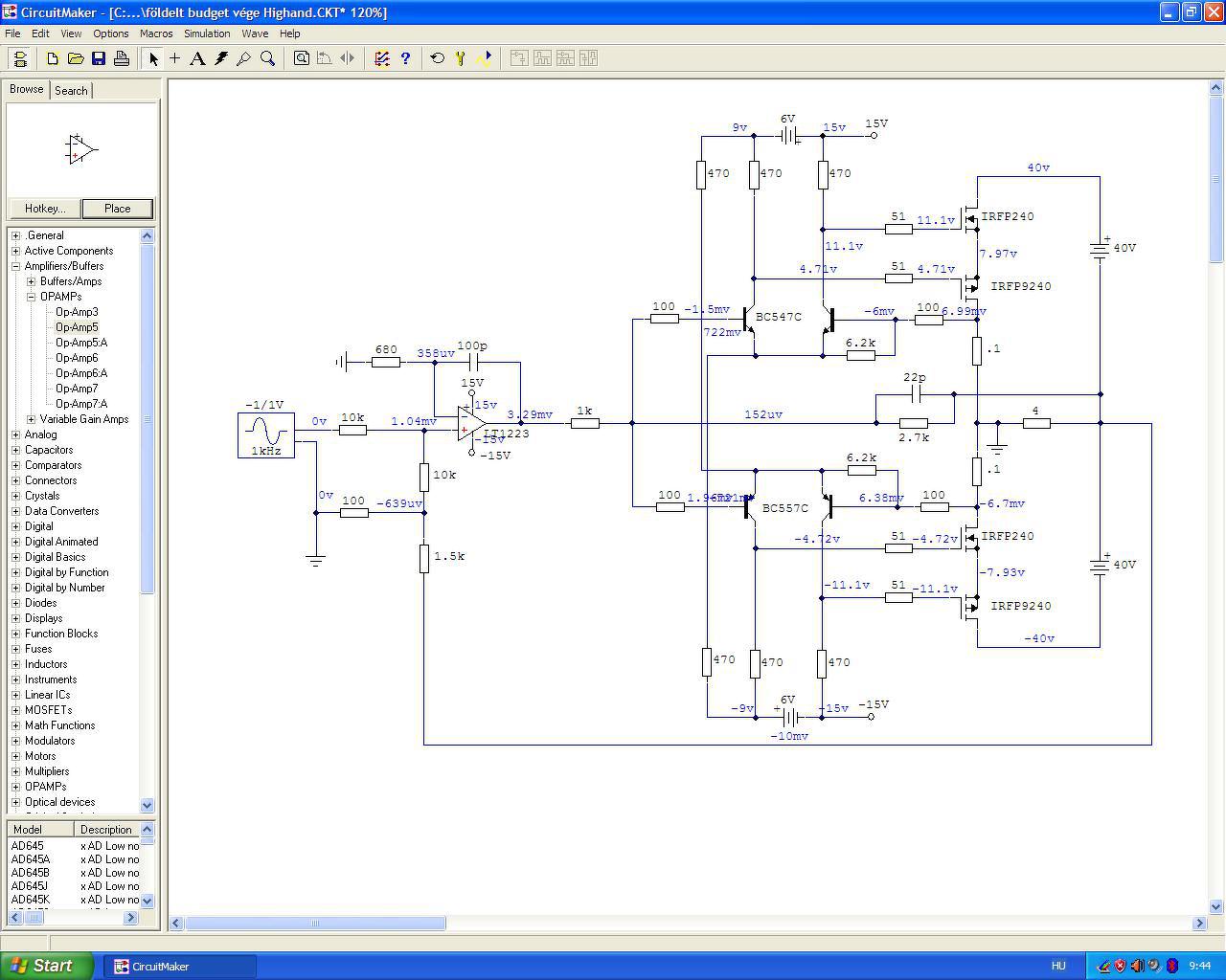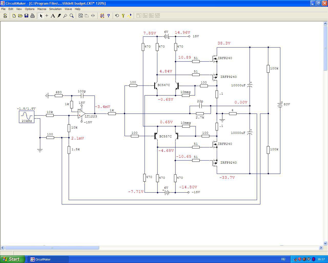 Ez így nagyon szuper! Már csak a segédtápon változtatnék, elég a +/-15V is. Kisebb lesz a kollektorokon a feszültségugrás és barátibb disszipációk adódnak a meghajtásban. A gyakorlatban majd 6.8V Zener kell a mostani 6V helyett, de ez már részletkérdés. Már látom, abban sántikálsz, hogy Te ezt így fogod használni zenekari izének, de valami impedancia illesztő akkor is kelleni fog majd a bemenetre.