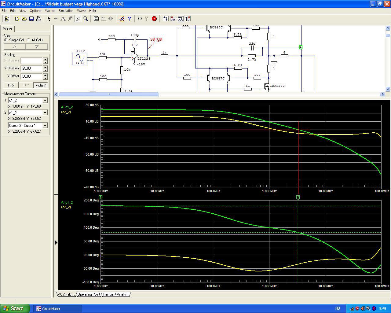 A Bode olyan, mint a nagykönyvben... ez a 82 fokos fázistartalék már mindenhez elég, mint a négyszög átvitel is mutatja 1µF-os terheléssel. Szerintem meg lehet próbálni a deszkamodell megépítését. (?) Az LT1223 kicsit drága opamp - 1200 bruttó a RET-nél - de szerintem ennyit érdemes áldozni erre a kapcsolásra (nekem meg van itthon a fiókban, tehát könnyen beszélek). Az invertáló bemenetére a gyári ajánlás szerint kell az 1k, különben gerjedni fog és a szimulátor is kiakadt a négyszögjelnél nélküle. Hátra van még a tápegység bonyodalma, ami most nagyon nem mindegy, hogy egy, vagy két Greatz-es lesz.