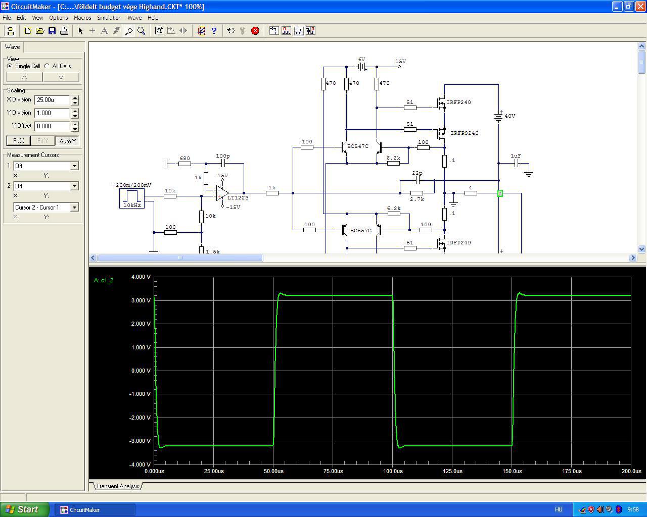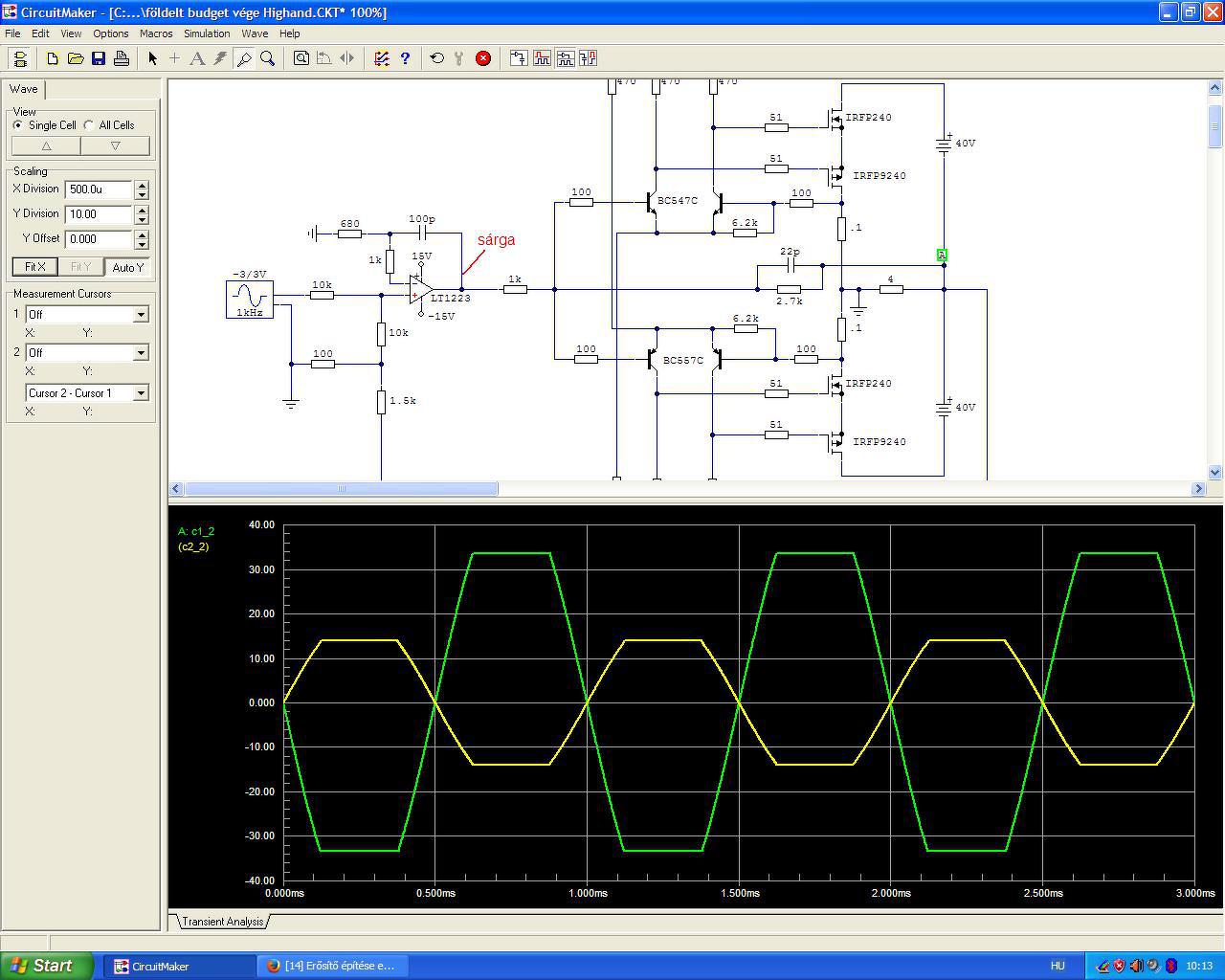 Elfelejtünk olyan dolgokat amiket pedig amúgy tudunk. Például, hogy a begerjedt erősítő alkalmatlan erősítésre, de azért hallgatjuk (a macskával együtt) másfél órán át és utána még véleményt is mondunk róla. Ztán meg azt, hogy a szimulátor is mutatta (és amúgy is tudjuk), hogy az áramkimenetű erősítő terheletlenül jó nagyot erősít és emiatt begerjedhet. És még eszembe is volt, hogy rajzoljak Zobel-tagot a nyákra éppen emiatt, de aztán kiment a fejemből. Meg még az is eszembe jutott, hogy a digitális szkóp tud jelet tárolni, oszt megnéztem és a negatív táp is gerjedt. Miután kétszer véletlenül rövidrezártam a végfokot és mindkettőt sikeresen túlélte, pedig az egyiknél jó nagy szikrát hányt miközben szólt miközben levettem a mérőcsúcsot, de nem zavartatta magát, csak szólt tovább.(Ez volt a sefülesefarka bevezető.) Szóval... ahogy bekerült a Zobel, helyreállt a rend. Megjött a mély, megjött a dinamika, lead 135 W-ot zeneiben a két párhuzamosított 8 Ohm-os SAL dobozon. Úgy peng a gitár, hogy azcsakna. Mocsok jól szól. Kegyetlen jól szól. Halkan is és hangosan is. Olyan számokon sem ugrattam át a CD-t amin a BD60-nál de. Amennyire el voltam keseredve délelőtt, annyira vagyok feldobódva most. Ez így jó, ahogy van. De persze bele fogok piszkálni, mert nem én lennék, ha nem.