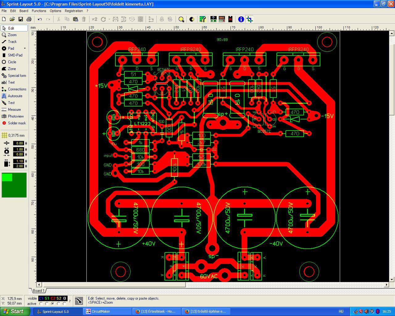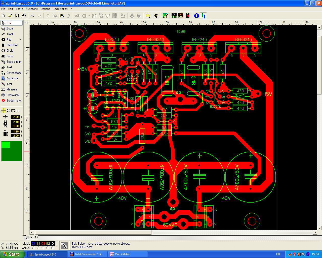 Szerencsésnek tartom, hogy az erősítő invertál. Nézve a rajzot, mindig azon kapom magam, hogy a test felőli IRFP-ket ki akarom piszkálni. Azután rájövök, hogy az bizony nagyon el van ott találva, majd ismét piszkálnám - itt tartok