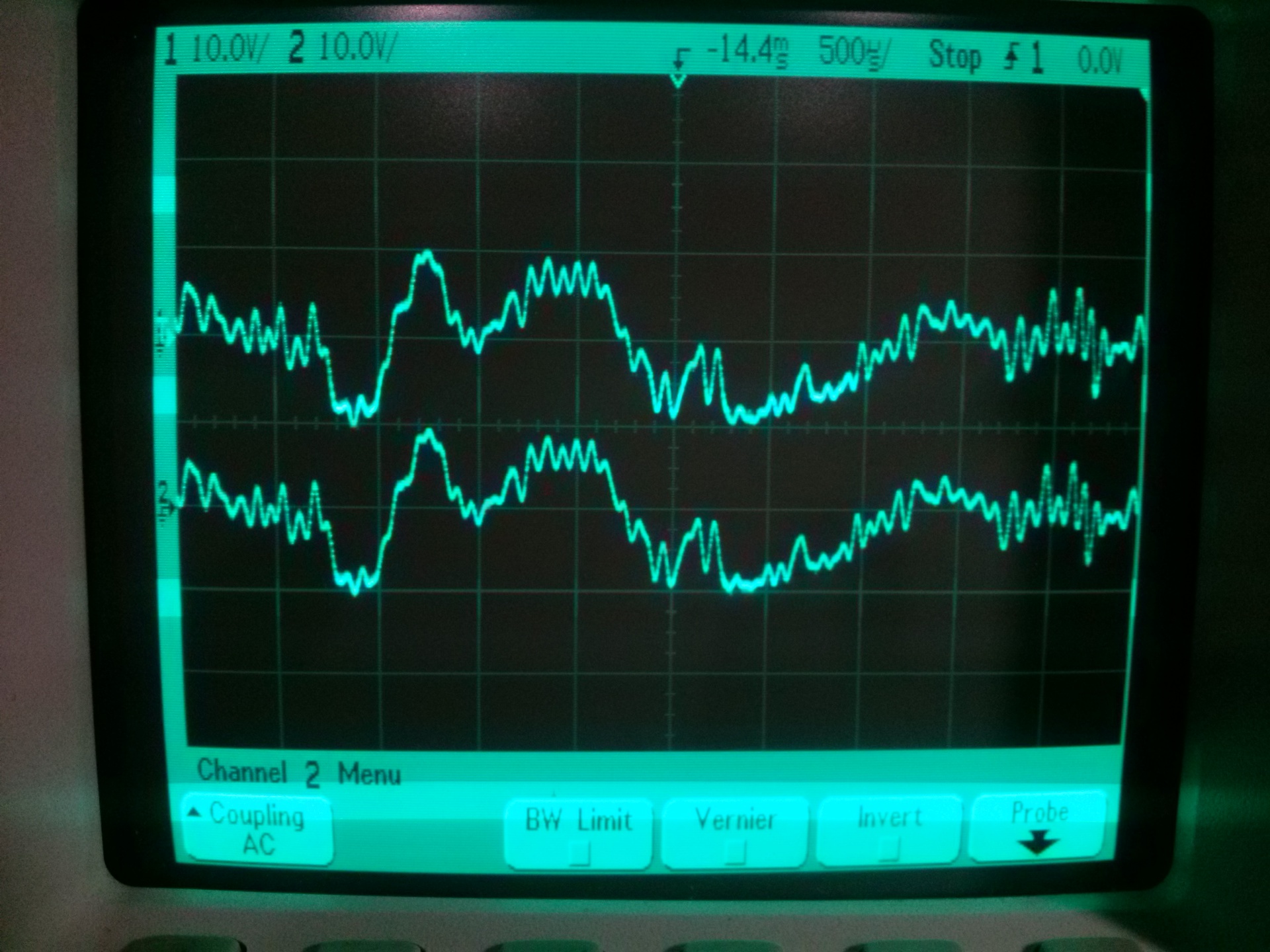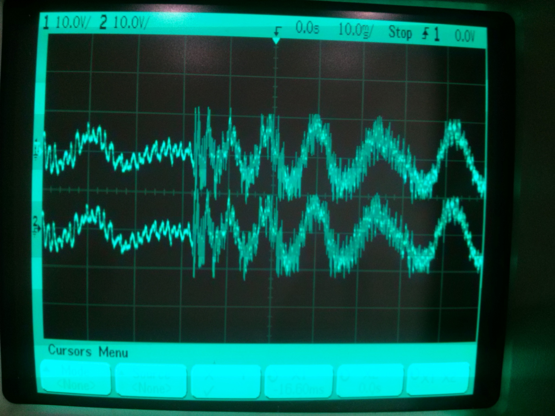 Az első két fotón az 1.ch a pozitív tápon, a 2.ch a negatív tápon. Azt vártam, hogy látni fogom a brummot a jelben, de nem látom. A második fotón a megnyújtottam a jelet, mert olyan, mintha nem lenne fázisban a 32. ms-nél a két táp, de abban van. A 3. és 4. fotón az 1.ch a pozitív táp, a 2.ch a kimenet. Így sem látszik a brumm. Mindjárt megnézem műterhelésen szinusszal. (A negyedik fotón nem a végfok klippel hanem a felvétel ilyen.)