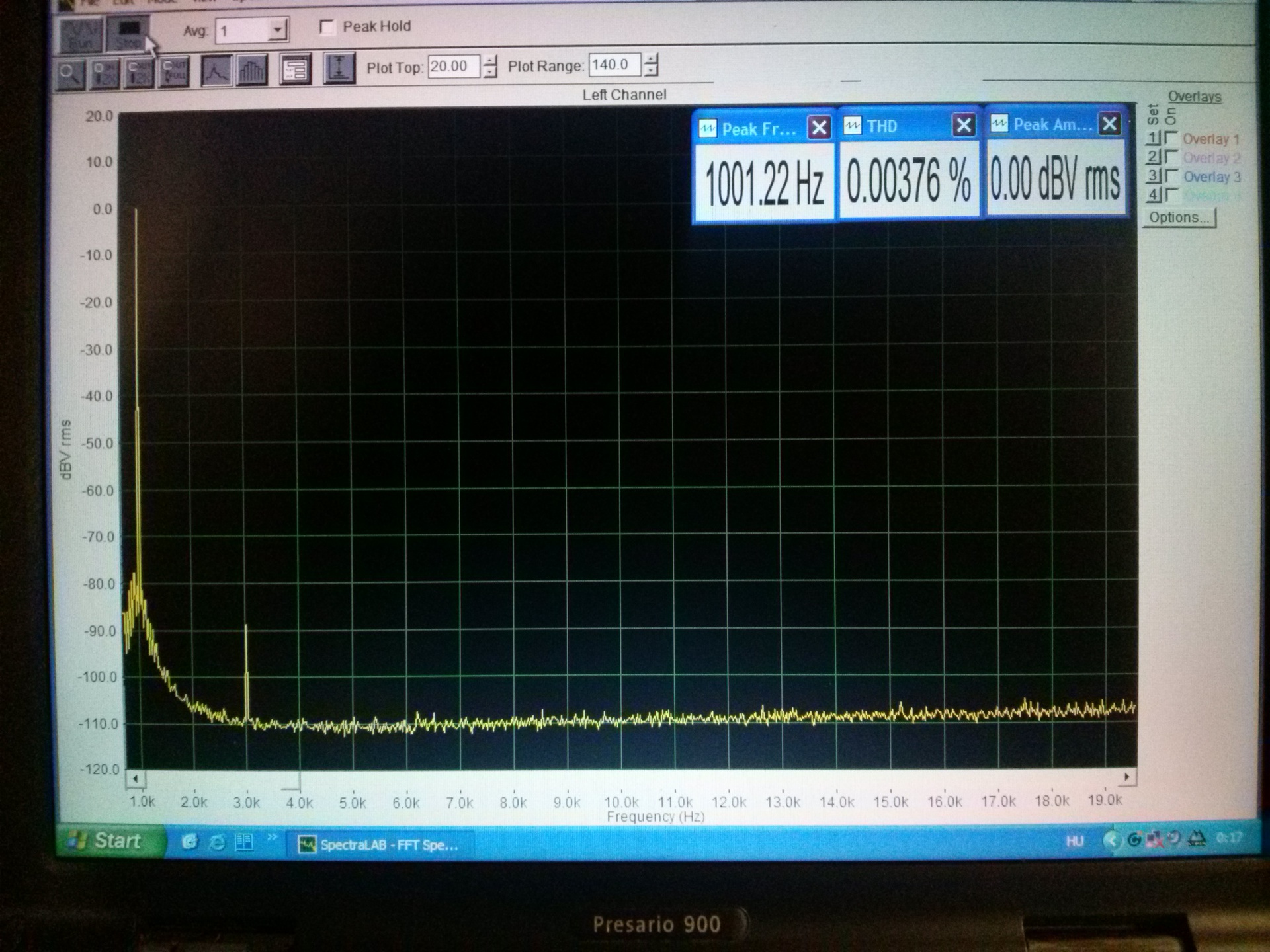 Az első három fotón sorjában: Uki= 0.3Veff, 1Veff, 3Veff Aztán a műterhelést használtam kimeneti osztóként (ha már annyi darabból van összerakva, legyen valami haszna ennek is). Az ötödik képen ugyanaz a 3Veff, de egészen más a torzítás spektruma, valószínűleg a hangkártya is torzít már +10dB-es szintnél valamennyit. Aztán a 6-7-8. fotón Uki= 10- 15- 20 Veff A terhelés végig 8 Ohm.