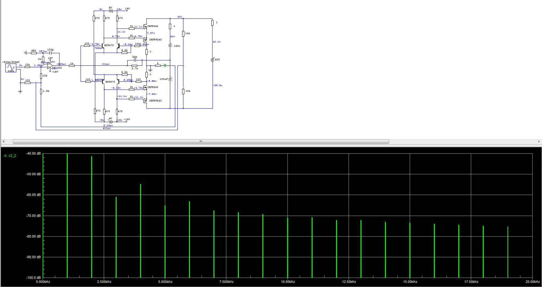 Viszonylag ritkán nézek be, ezért nem követtem végig ennek az erősítőnek az útját itt. De most hogy a kapcsolást nézem, felmerült bennem egy kérdés: mi történik amikor az erősítő ki van vezérelve, hogyan oszlik meg a maradék feszültség a sorba kapcsolt P és N csatornás FET között? Nézted szimulációban és a gyakorlatban a feteken eső feszültségeket?