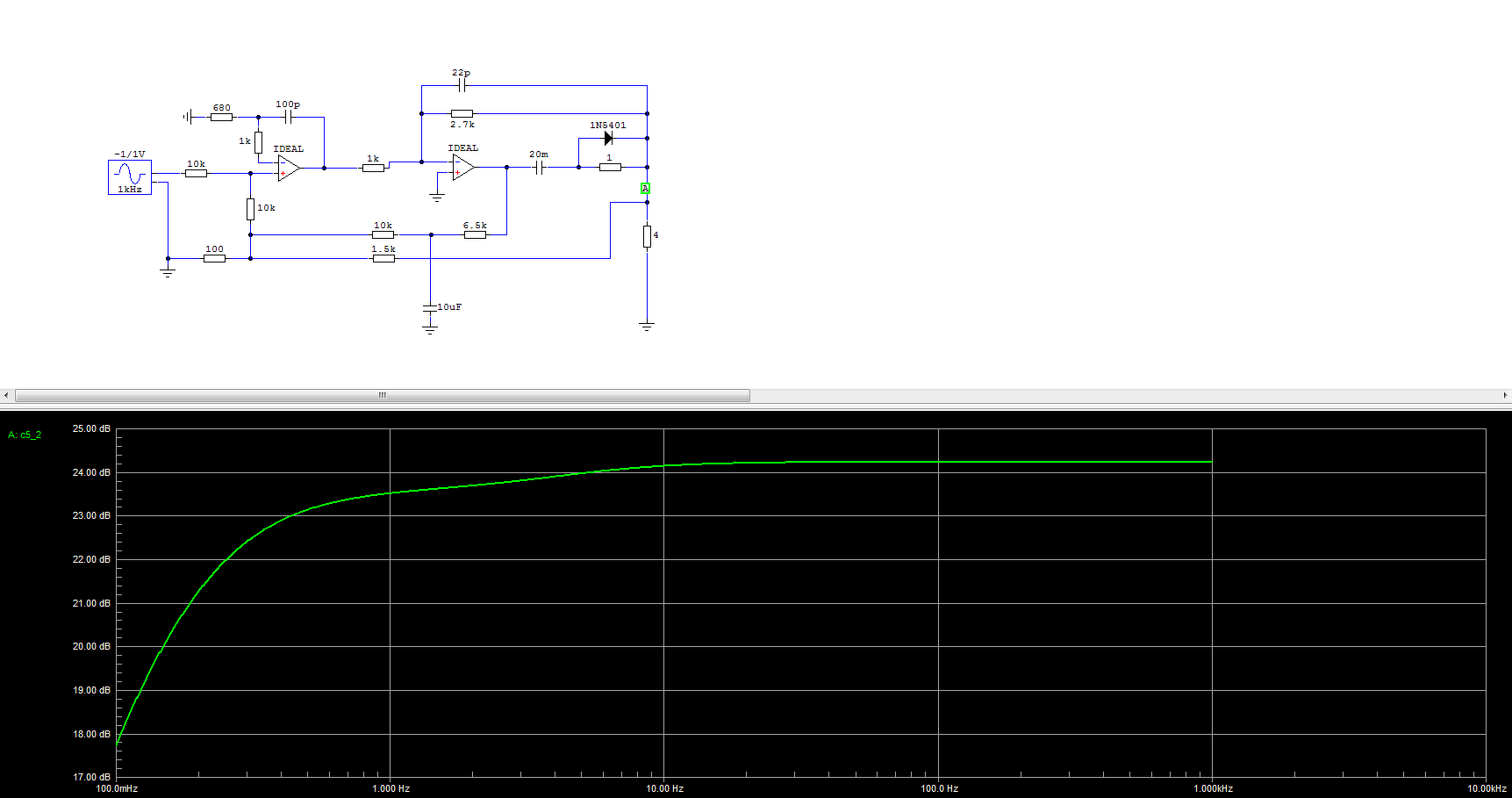 Ezzel dél óta szívok folyamatosan. Azt gondoltam, hogy opampos integrátor jó nagy időállandóval oszt kész, de sehogy nem jött össze. Újabb töréspontot nem szabad belevinni, vagy legalábbis nekem sikerül úgy elfogadhatóra megcsinálnom. Maradt ez a Quados módszer, de ez sem volt egyszerű. A pufferrt nem szabad 100µF-ra csökkenteni, mert fázishibát okoz, az 1mF-ossal meg nagyon lassú a szimuláció, de ezt kellet választani.