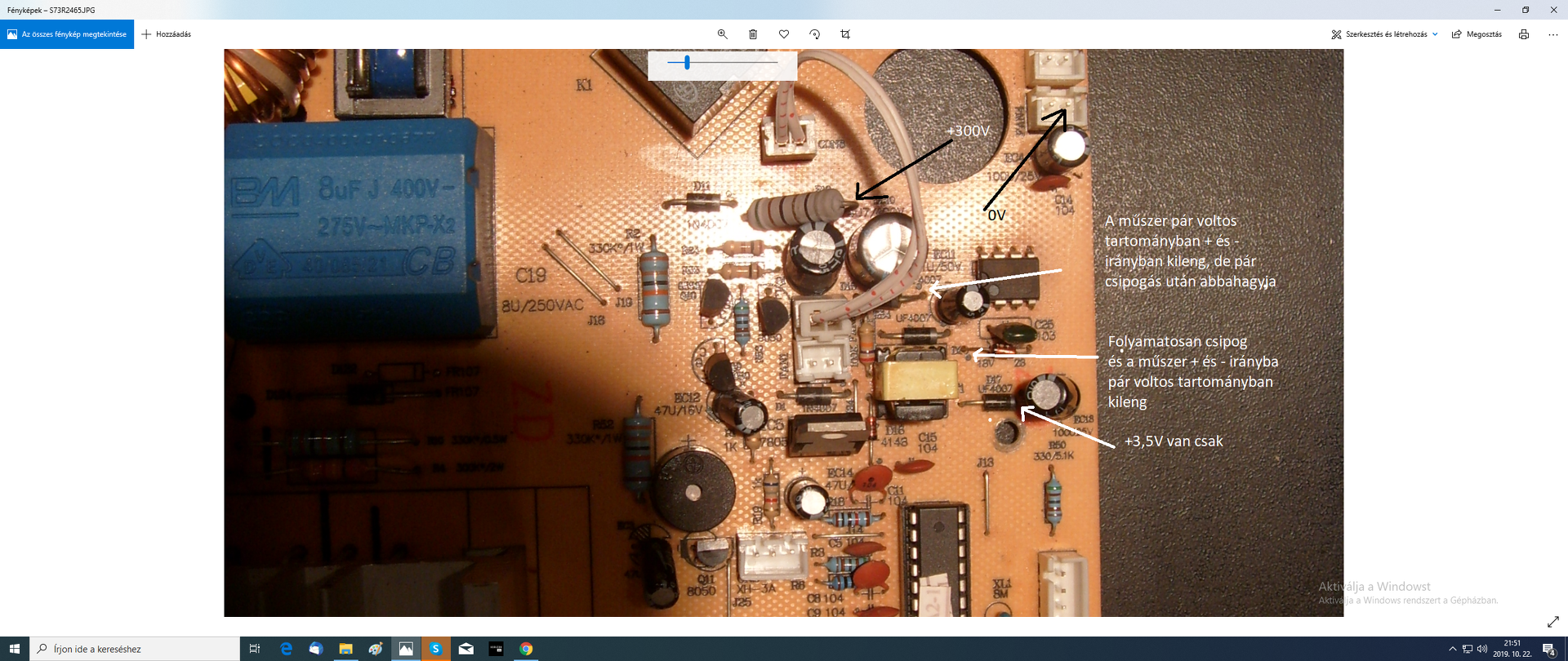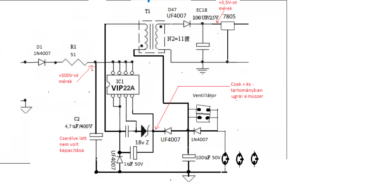 Előtte méregettem a fő tápon. A 4,7µF elektrolit kondin +300V van, ez volt kiszáradva! A többit a fotón látni. Esetleg az 1µF kondi is produkálhat ilyet, ami a Viper22 1-es és 4-es lábát köti össze?