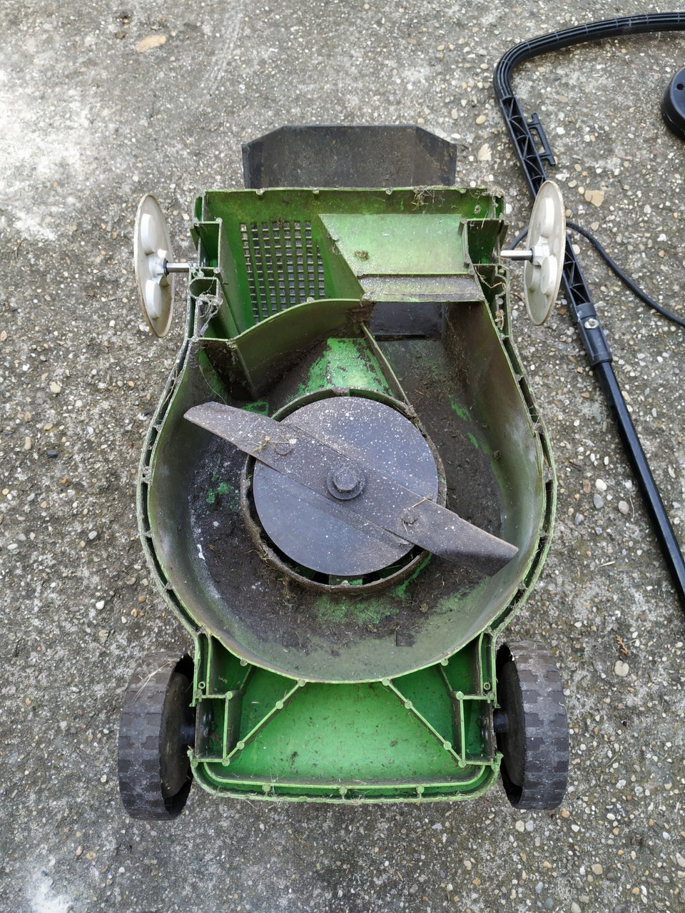 Fűnyíró kipukkant motor kondenzátorral, törött kapcsolóval, hátsó kerék nélkül.