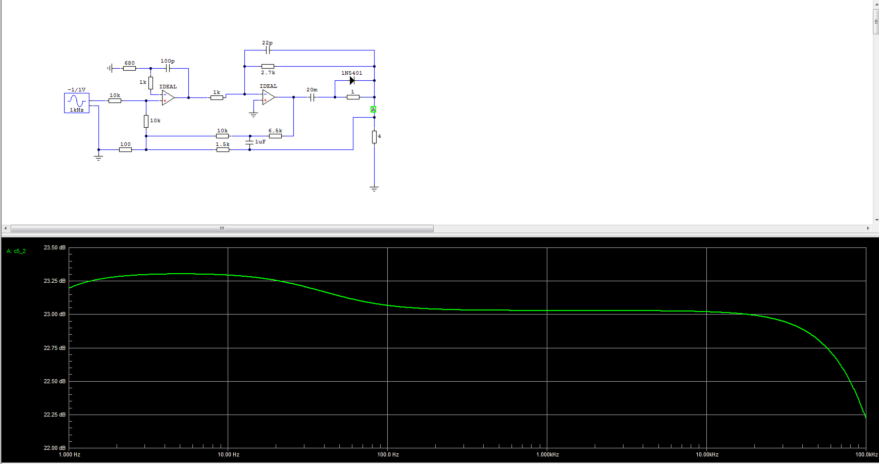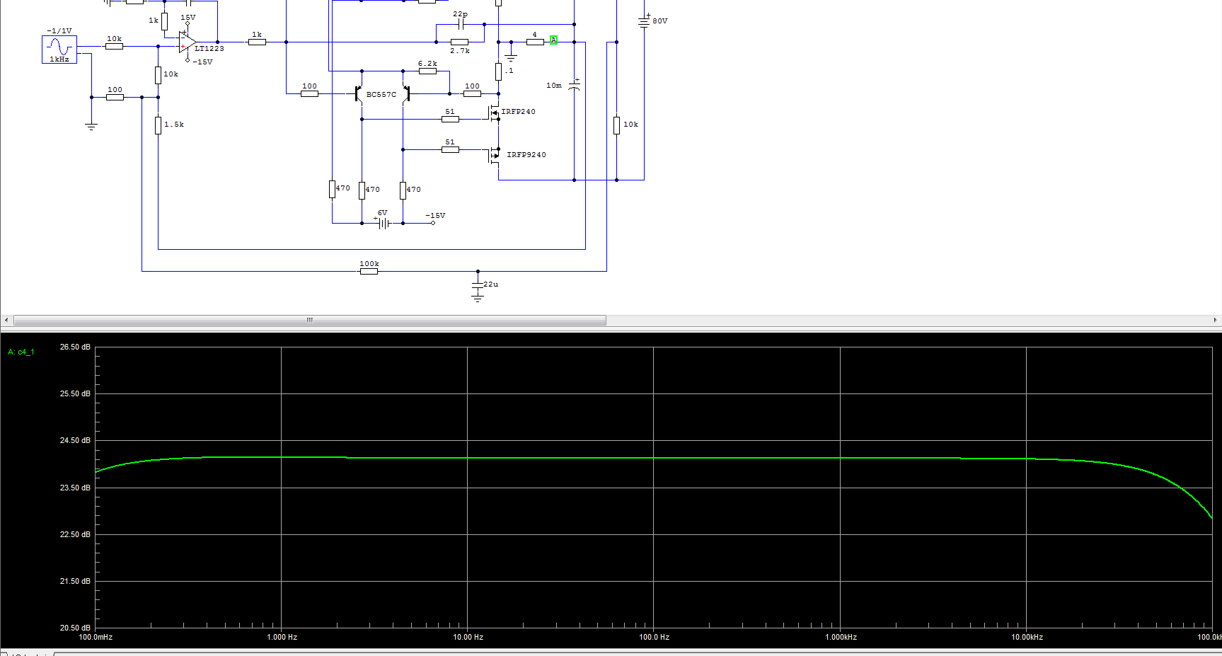 Ezzel dél óta szívok folyamatosan. Azt gondoltam, hogy opampos integrátor jó nagy időállandóval oszt kész, de sehogy nem jött össze. Újabb töréspontot nem szabad belevinni, vagy legalábbis nekem sikerül úgy elfogadhatóra megcsinálnom. Maradt ez a Quados módszer, de ez sem volt egyszerű. A pufferrt nem szabad 100µF-ra csökkenteni, mert fázishibát okoz, az 1mF-ossal meg nagyon lassú a szimuláció, de ezt kellet választani. Ezzel a tranzisztoros izével meg az a gond, hogy "A" osztályba kell állítani, különben ez is torzítást visz bele. Az "A" osztállyal meg az a gond, hogy könnyen át tud menni "AB"-be nagy kivezérlésnél, vagy elfogy az árama és leklippel. A számtalan variáció közül ez már így jónak tűnik. A fejem már zúg tőle, majd nézd át holnap Te is ha lesz időd és kedved.