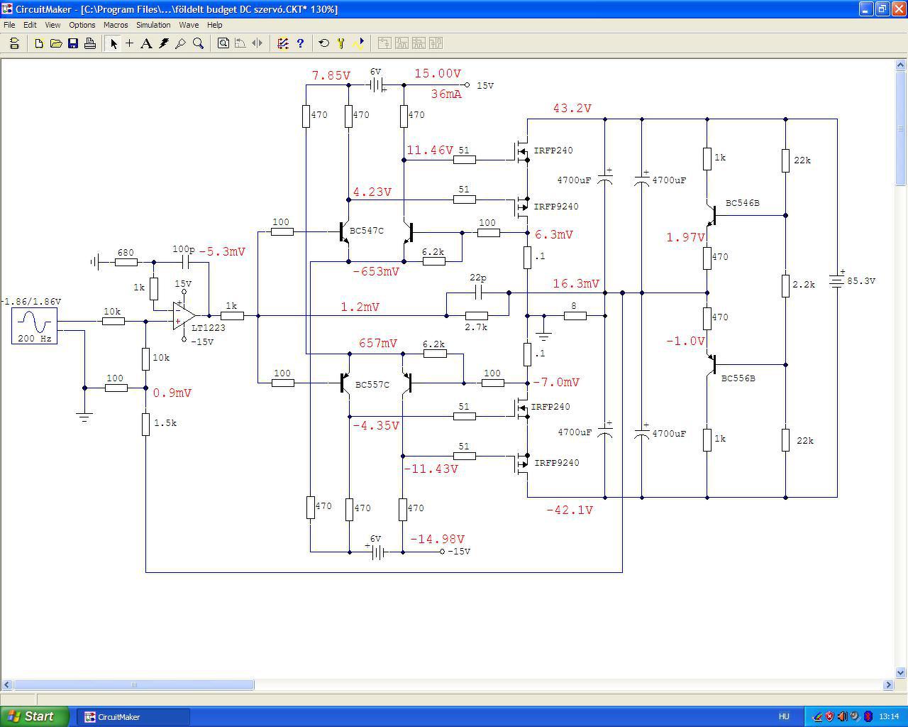 Viszonylag ritkán nézek be, ezért nem követtem végig ennek az erősítőnek az útját itt. De most hogy a kapcsolást nézem, felmerült bennem egy kérdés: mi történik amikor az erősítő ki van vezérelve, hogyan oszlik meg a maradék feszültség a sorba kapcsolt P és N csatornás FET között? Nézted szimulációban és a gyakorlatban a feteken eső feszültségeket?