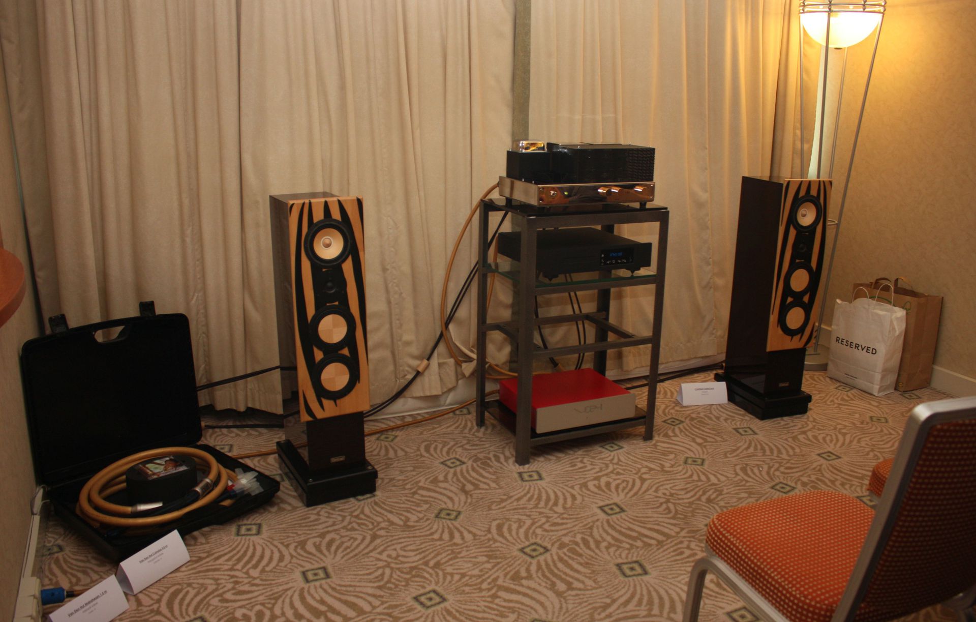 Audiophile Saloon másik szobája. Fekete zongoralakk szerűség a hangfalon, amiben oszlopszerűen króm keretes hangszórók. Rendkívül részletes a hang, de nem karcos, hanem tiszta. Itt az erősítők piszok jók. A kábelezésen még lehetett volna dolgozni, a hangkép kissé fel van borulva felfelé. 200-500Hz között a hang kevés, vagy én állok rossz helyen.
