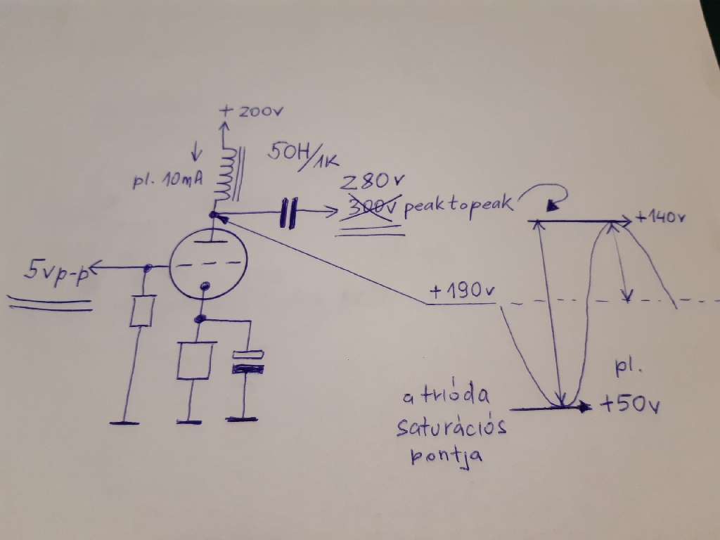 2, Sajnos tunerman a rajznak azt a részét elrontotta. A "például 80V" szaturációs feszültség a földhöz képest értendő, de a "+264V" már a 344V-os anódfeszültséghez képest, ott tehát 608V a csúcs, ha szimmetrikus a színuszjel. És igen az anódon ez a 608V mérhető csúcsban, a földhöz képest.