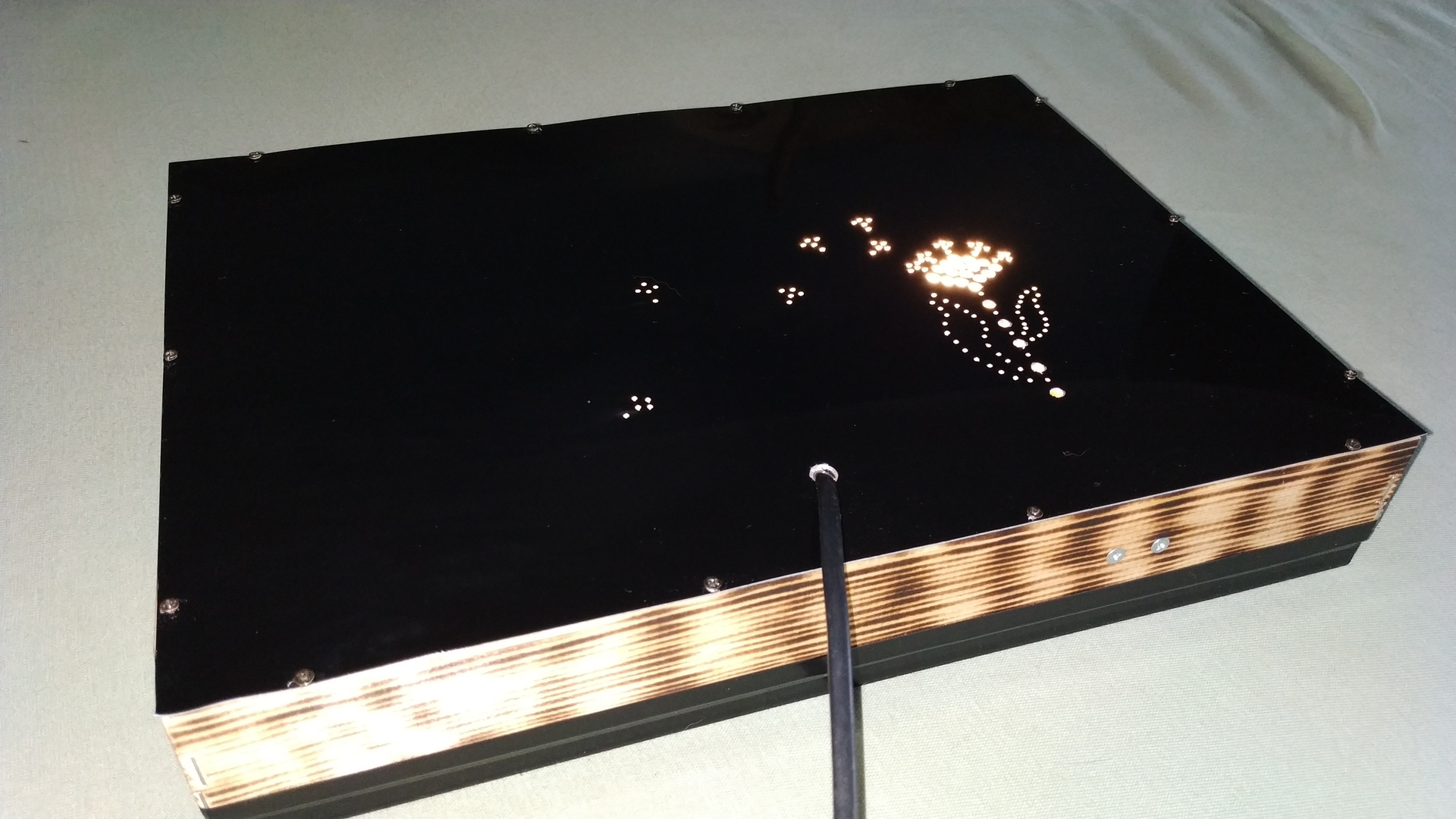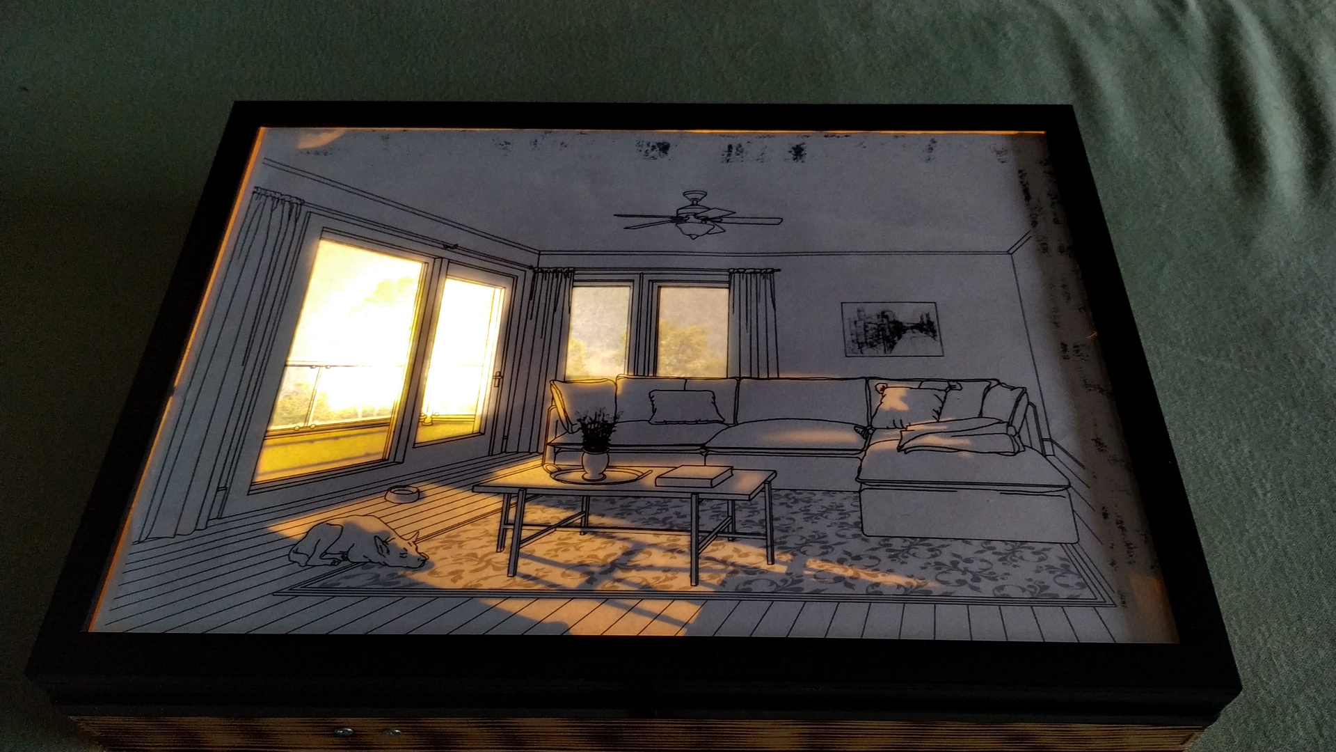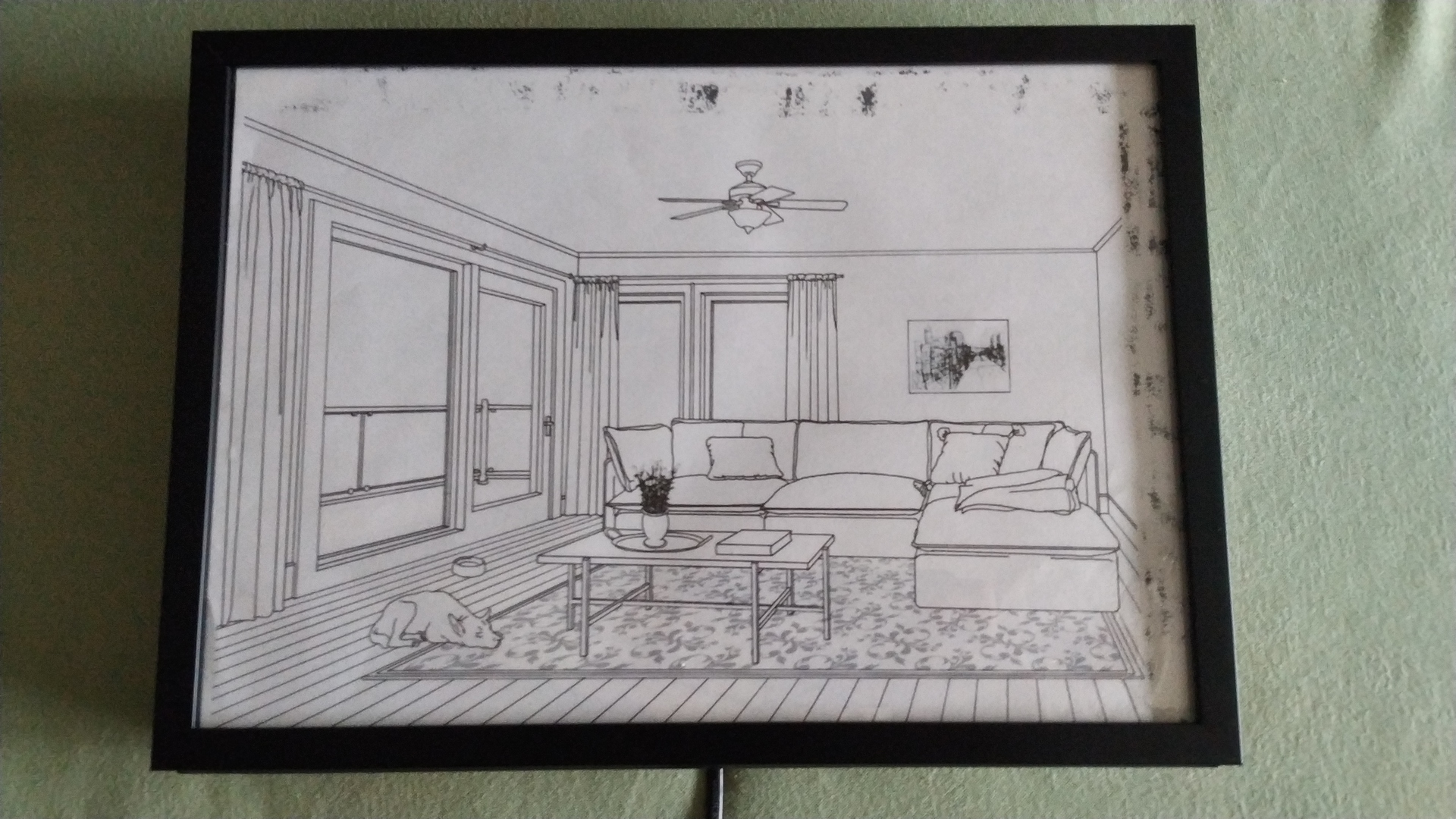 Egy youtube-os videó alapján készítettem ezt a dekor képet egy rövid óra alatt. Csak ki kellett nyomtatni 3 képet, egymásra rakni és hátulról megvilágítani. A színes képet átlátszó fóliára kellett volna, én egy zsírpapírszerűségre nyomtattam, nem lett az igazi. Csináltam pár szellőző furatot a hátlapra, mert a kis ledes égőnek is van egy minimális hőhatása. A képkeret nagyobb, mint kellene, besatiroztam alkoholos filcel a felesleget, kicsit átütött az előlapra. Lusta voltam újranyomtatni. Nehéz volt jó képeket és videót készíteni az ellenfény miatt. |