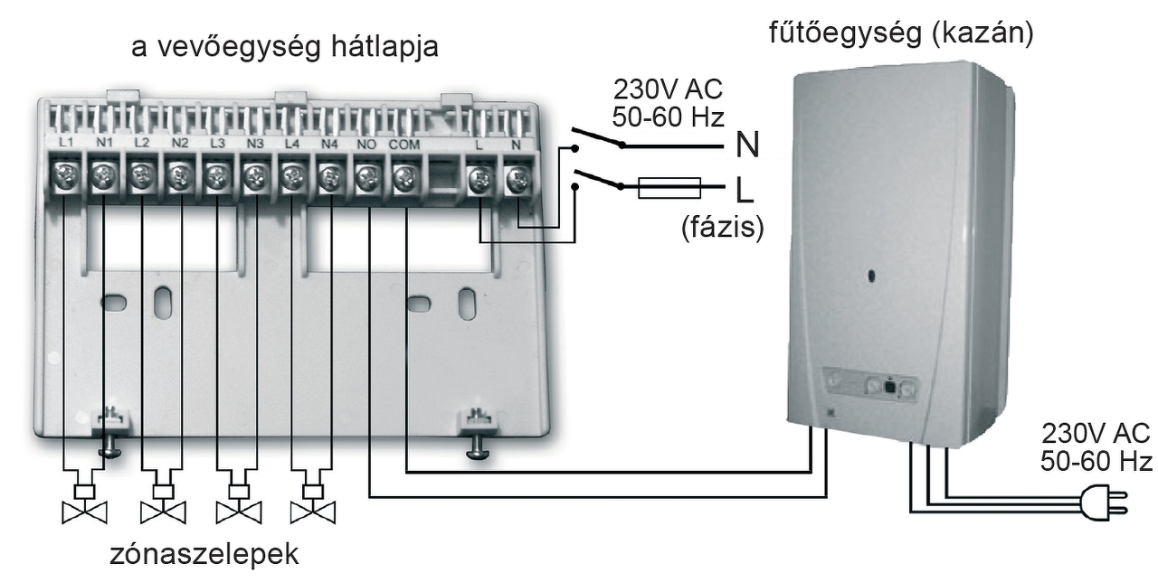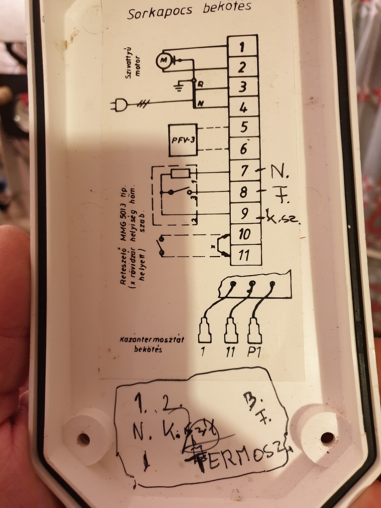 Igen, Neked van igazad. Ha feltételezzük, hogy a kazán jól van bekötve, akkor az általad javasolt bekötés helyes: 3(N) <- 7 4(L) <- 8 2 -> 9 (vagy 1 -> 9 ?) Bár azt nem értem, miért verte le az automatát. Elvileg csak a termosztát tápja nem volt így állandó.