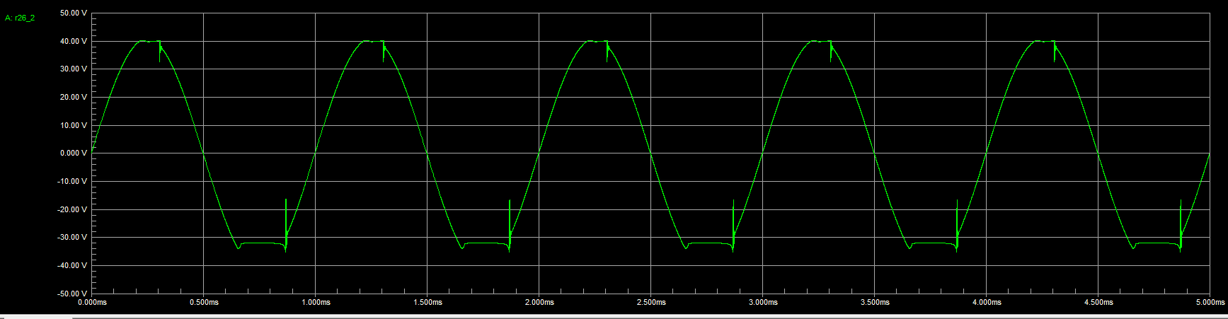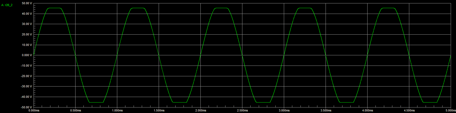 Két dolog miatt teszi ezt. Egyik, hogy a bemeneti opa túl akarja szabályozni a torzulást, amit kis korrekcióval meg lehet oldani, Az opa kimenetén látszik az igyekezet. De ez csak az egyik probléma. A nagyobb, hogy a negatív félperiódus borzalmas.