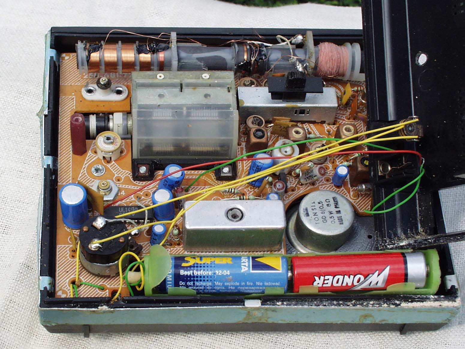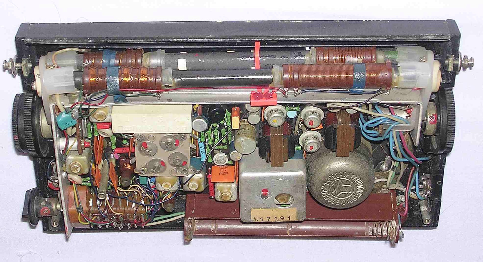 Akármennyi huzallal próbáltam pótolni, ami felvált, mindig tovább hámlott a fólia. Végül teljesen megkopasztottam. Ilyen fóliát még életemben nem láttam. Talán valami gőzöléses eljárással vitték fel rá, mert maratni ilyen vékonyra nincs értelme. Egyszerűen javíthatatlan. A kapcsolói is elég furcsák voltak, nem lehetett kideríteni, mi hová megy, bonyolult nyomtatott áramköri rajzolatok voltak maguk a csúszkák. Buta gyerek voltam, mert gépfegyver ropogást akartam a hangszóróból, ezért elektromos gázgyújtóval az antennára csattogtattam. Azért kellett volna keverő tranzisztort cserélni, de már volt akkor AF 106-om, nem sikerült kipróbálni benne.