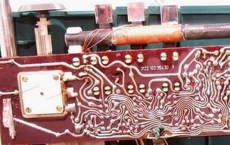 [off]Tizenéves gyerek voltam. Azt ugyanúgy nem tudtam, mennyit segített volna rajta egy visszacsatolás, ahogy nem tudtam mi lesz, a vége, ha pisztolypákával próbálom beforrasztani az AF 106 - os keverőtranzisztort egy ilyen fóliába. Sőt még igazán letesztelni sem volt időm, mert apám elmesélte annak az illetőnek, aki addig erőlködött, míg odaadtam neki. Az vigasztalt, hogy úgyis tönkretettem már teljesen. Remélem a képen jól látszik, mennyire extrém vékony volt a panel fóliázása. /off]