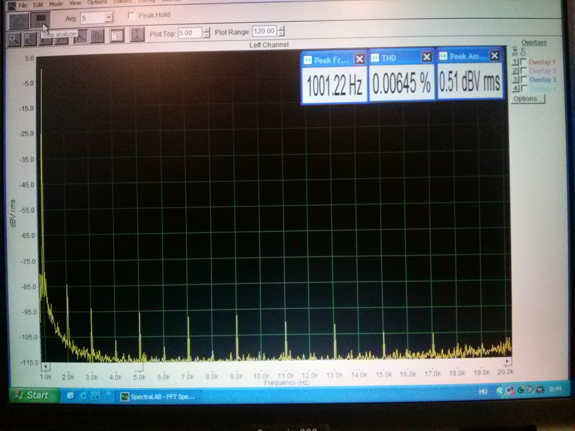 A képek sorban: 0.25W, 1.25W, 50W/8Ohm. A 4. kép a zaj, ahol 0dB=1Veff, nyitott bemenetnél mérve.