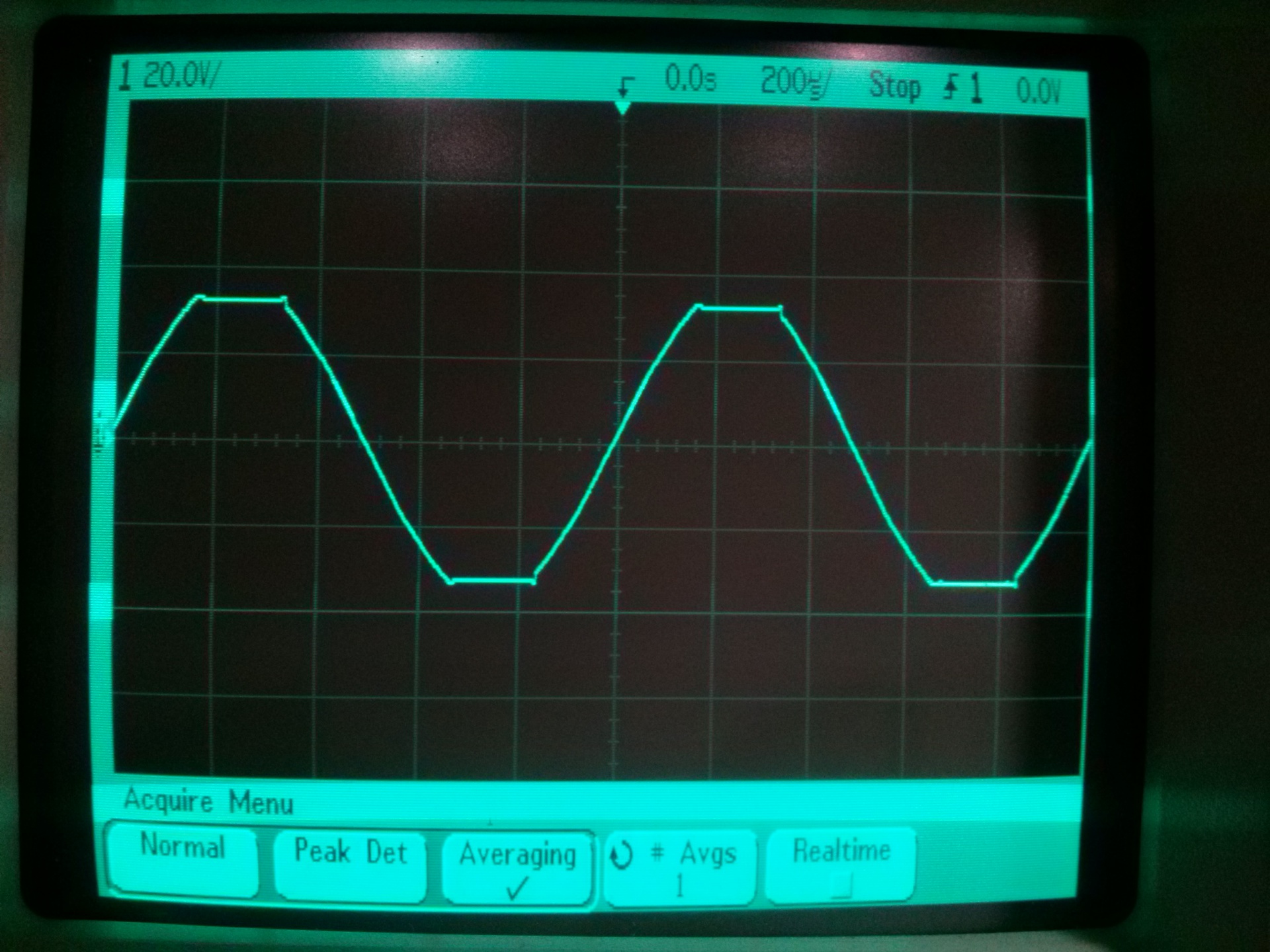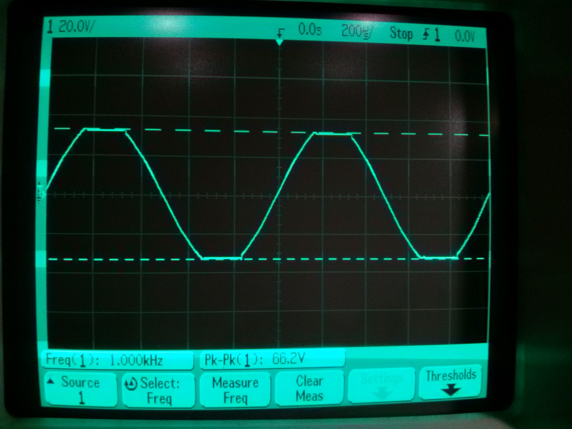 Feltámadt bennem a gyanú, hogy túl nagy kivezérléssel jár az LT1223. (Első közelítésben még az volt fontos, hogy szépen klippeljen a végfok.) Megnöveltem a teljesítményfokozat erősítését és 4.7k-nál még aránylag jó klipp, de a THD ennyire csökkent amennyit mértem. A klippelés pedig így néz ki.