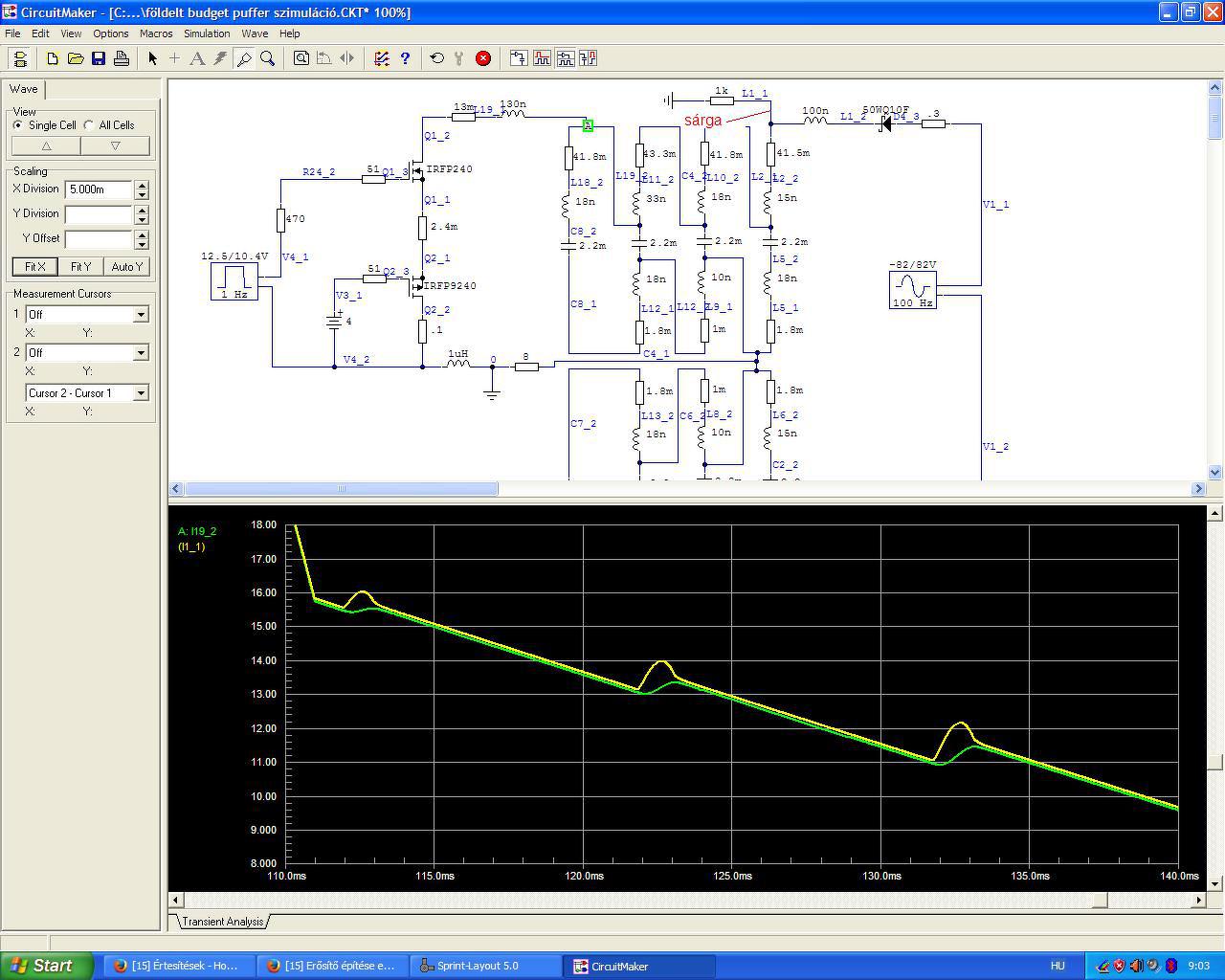 Kifelejtettem a pufferek belső ellenállását amit most pótoltam, az induktivitásuk még most sincs benne a szimulációban de már így is látszik, hogy amit Te javasolsz, annak úgy kell lennie. A hálózati zavarokat már nem bírja a CM (vagy a gépem), lefagy.