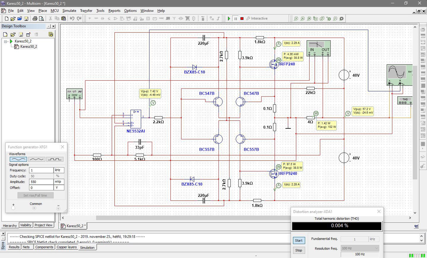 A szimulátor szerint jól működik. Kb 0 nyugalmi áramnál 100W/4R-en a torzítása 0.002...0.004 között ugrált, 1.1Vpp bemenőjel esetén. A sávszélessége több 100kHz(kb 1MHz-nél kezd esni). Aláhúznám nyomatékosan, hogy ez csak egy szimulátor, megépítve nem volt - általam nem is lesz -, de aki érez hozzá kedvet kipróbálhatja...