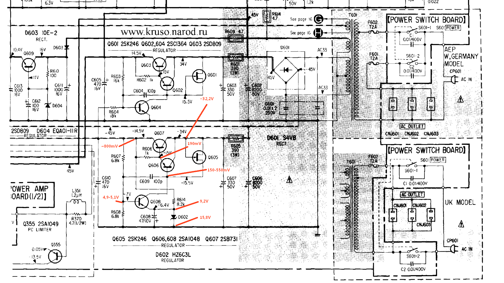 Vettem egy Sony TA-AX44 típusú erősítőt, ami nem működött (se kép, se hang). Mivel egy közel majd 40 éves készülékről lévén szó, mindjárt a tápokkal kezdtem. Mint kiderült sajnos az összes ELKO cserére szorult benne, legfőbbképen a nagy kapacitásúak. A cseréket követően a készülék újra életre kelt, viszont elakadtam a táp 14V-os ágainál. A táp tranzisztorai, ellenállások, kondik kimérve, jó mindegyik. A csatolt képen a Q603 tranzisztor emiterén jelenleg 29V, a Q607 tranzisztor emiterén pedig 0V mérhető. A protect relé nem húz be, de a R603 és a C604 pontján mérve a relé egy pillanatra behúz, majd elenged. Ebben a pillanatban a Q607 emiterén kb. 8V feszültség jelenik meg. Kérdésem ez ügyben, hogy a Q601 és Q605 (2SK246) FET milyen szerepet játszik a tápban? Lehetséges, hogy azok döglődnek? A "Skory-féle" teszt mind kettőt jónak mutatja (már ha valóban jók).