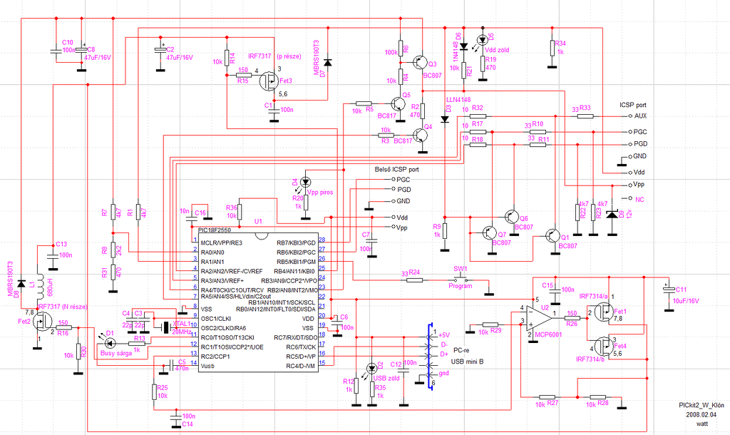 A PICkit2 Mircochip PICkit2 oldal -án mindkettőt megtalálod. Firmware és a rajz a Users`s guide végén.