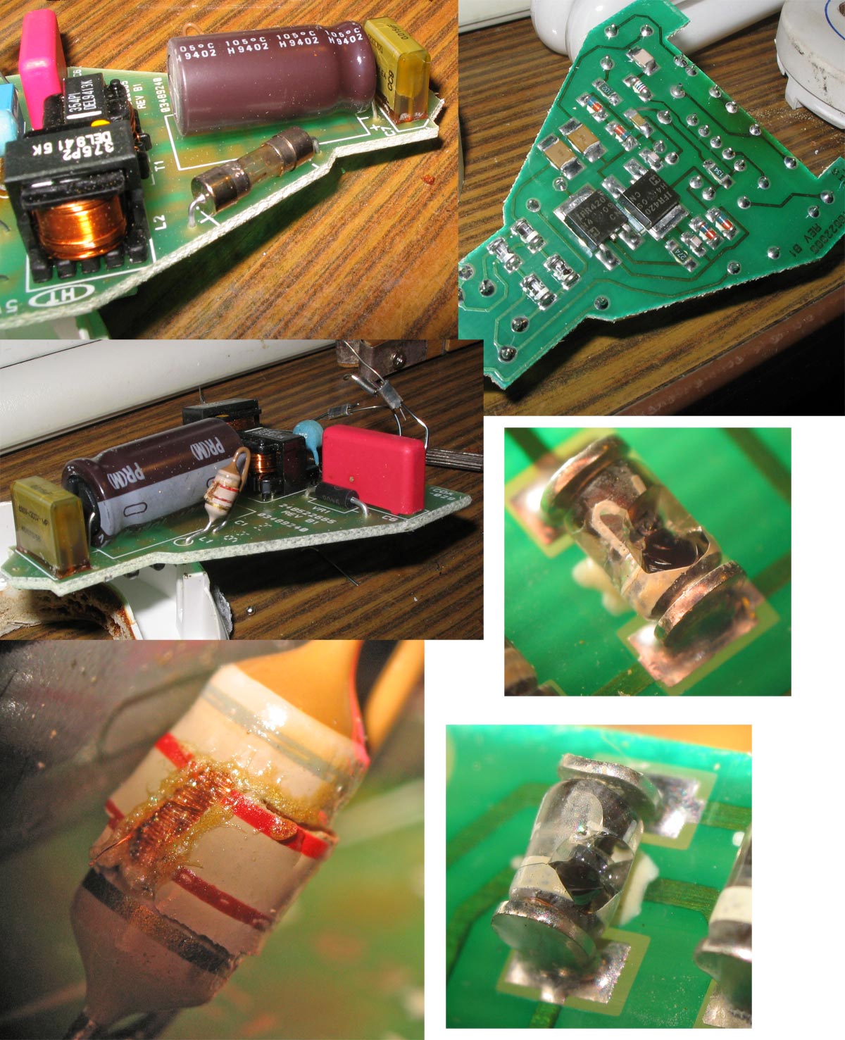 Ma a pincéből bányásztam egy törött csövű, régi tungsram kompaktfénycsövet. Azt terveztem hogy a megmaradt 1 kinai csővel összeházasítom ezt is. De mikor kiszedtem az elektronikáját, ledöbbentem. Elég ramaty állapotban van, pedig nem sokat mehetett mivel a kondi nem púpos, fetek körül se fekete a nyák. Viszont ha jól látom 1 biztosíték, 1 tekercs, legalább 2 dióda kipurcant, bemeneti szűrő 0.015µF is furán repedezett. Na innen lesz szép nyerni