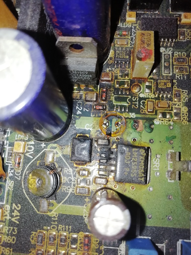 Az a fekete trutyi az elektrolit kondenzátorból folyhatott ki? LM25 pinjeire is ráégett valami.
