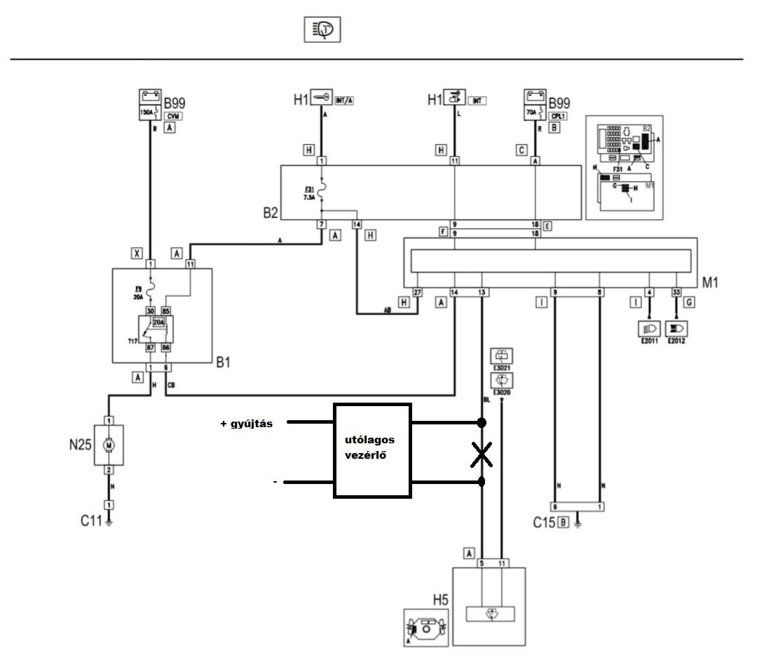 A normál ablaktörlőt nem a fehér/kék vezeték kapcsolja. A bcm-ből kimenő időjel, ami a relét meghúzza, az figyeli a relének a tekercsellenállását, és ha ez meg van szakítva, eltárolja hibának a gearban.